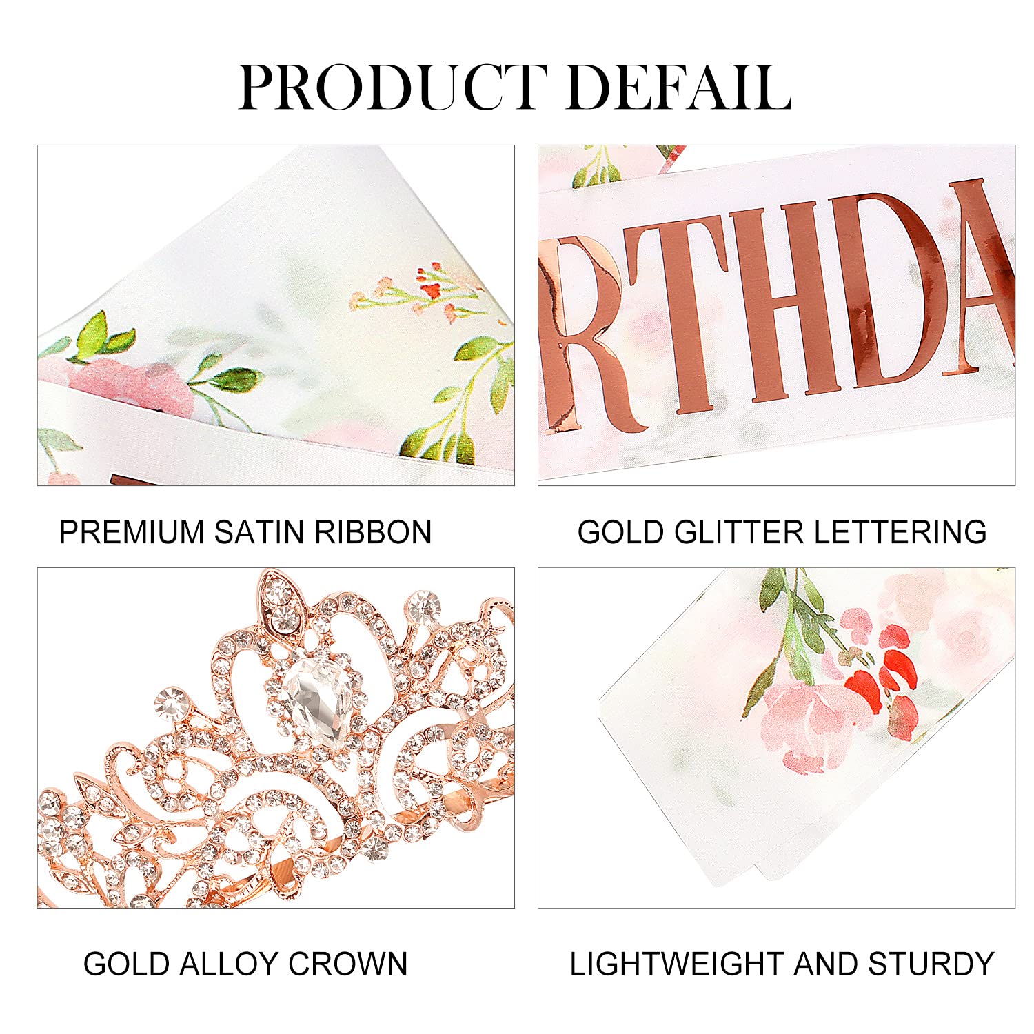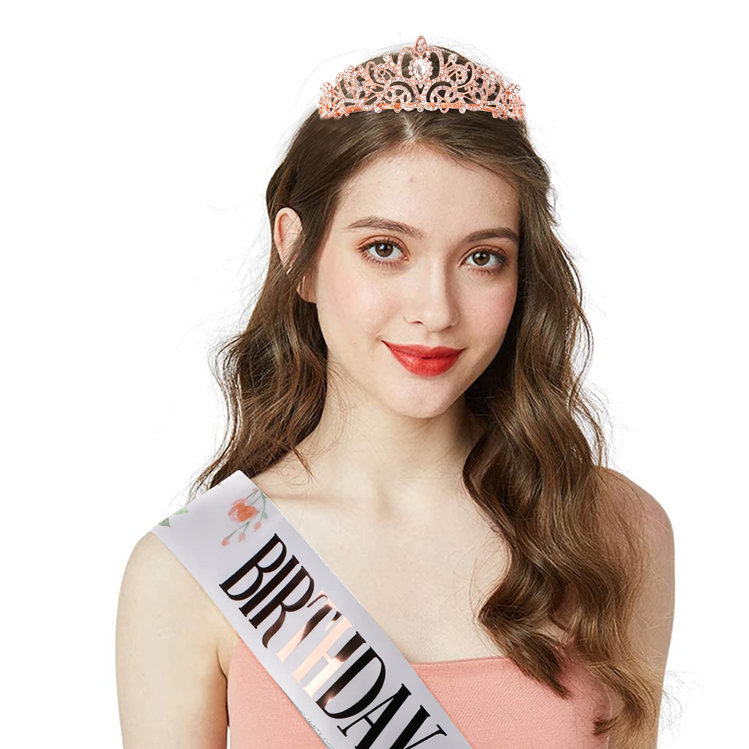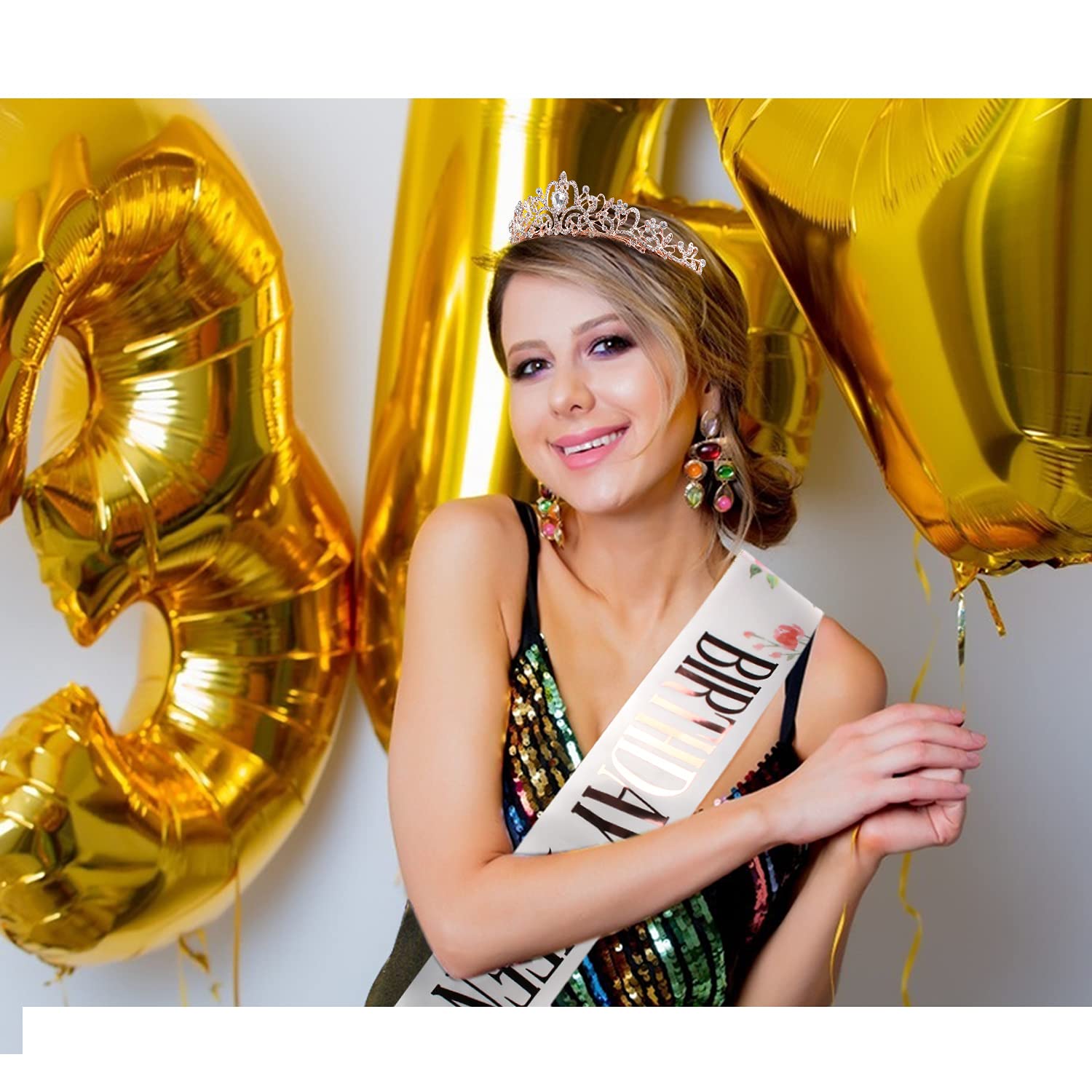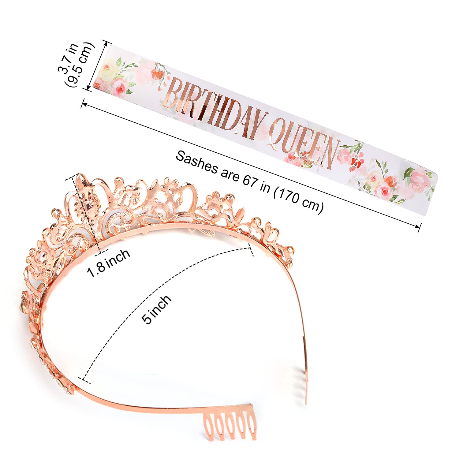 🎁ROSE GOLD SASH + CRYSTAL TIARA - Our sash is constructed of the most beautiful gold glitter material and hand pressed foil that reads "BIRTHDAY QUEEN" - each sash measures 3.5 inches wide and 33 inches long. The birthday tiara is made of rhinestone and alloy, sparking and beautiful make you more charming and eye-catching. Each tiara measures 4.92 in (12.5 cm) in diameter, 1.57 in (4 cm) in height.