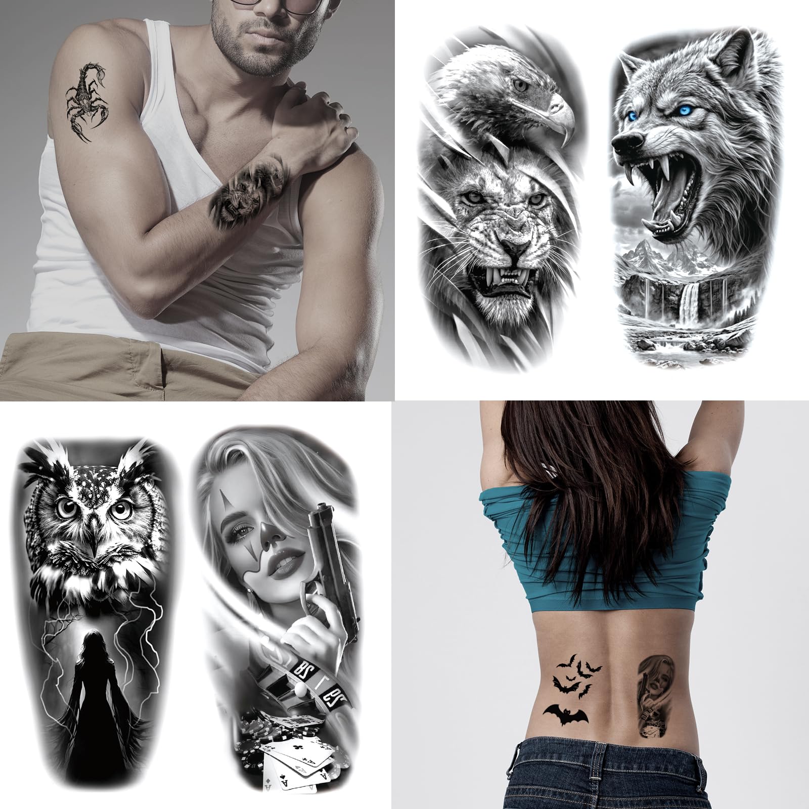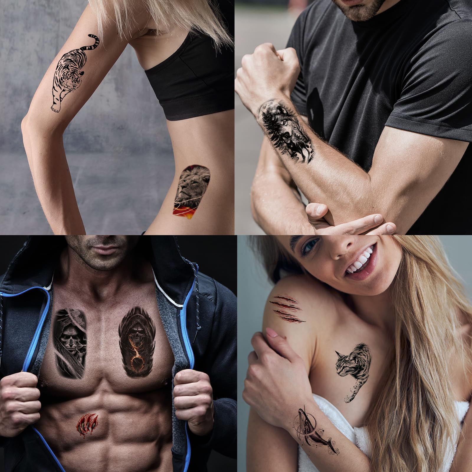 ❥【HIGH QUALITY & LONG LASTING TATTOO】 - Crafted from non-toxic, waterproof materials, those fake tattoos are waterproof and last 5-7 days. Guaranteed to dazzle, our lion wolf snake tiger scary skull skeleton temporary tattoos stickers are perfect for women and girls of all ages to get noticed wherever you are.