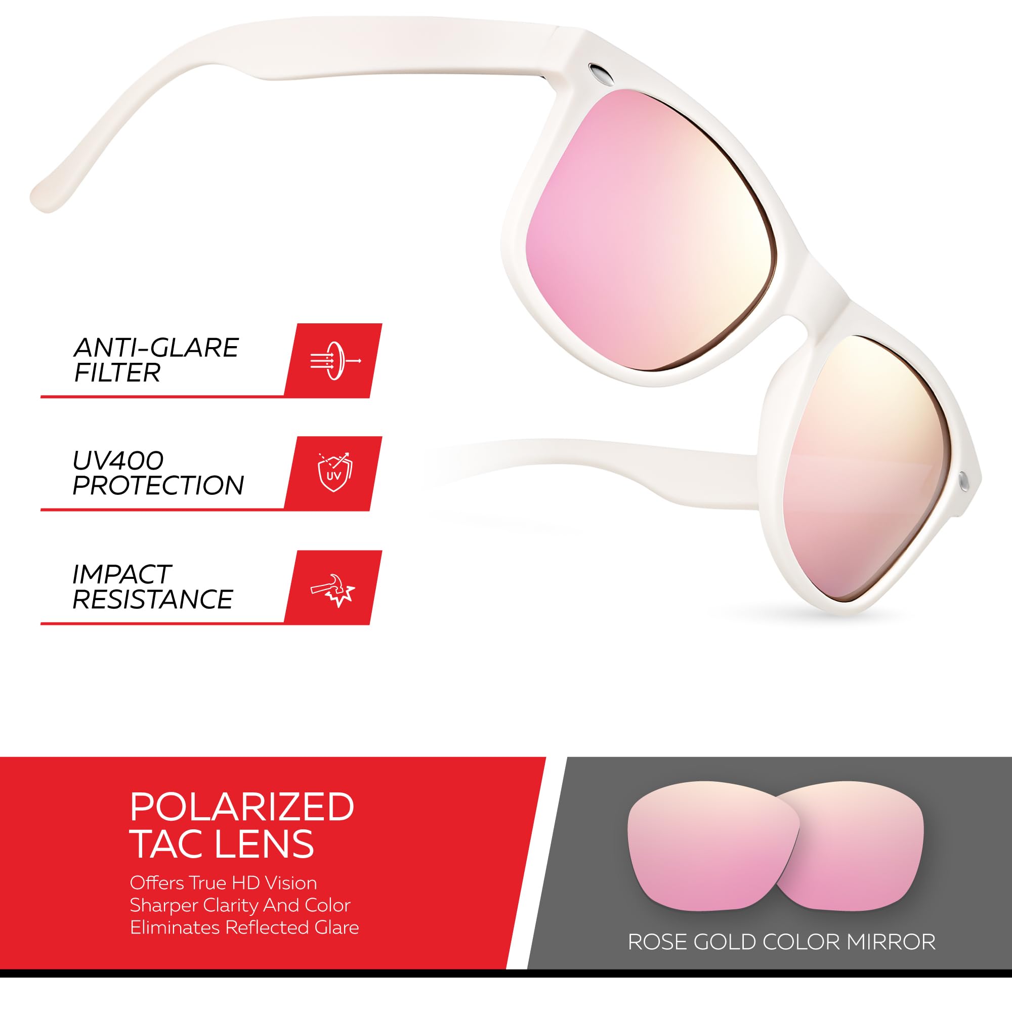 🕶️ 1.1MM TAC POLARIZED LENSES WITH UV400 PROTECTION: Keep your eyes safe from that annoying glare from shiny surfaces (e.g. pavement, snow or water) with our designer sunglasses for women and men, which feature polarized anti-glare lenses with UVA & UVB protection.
