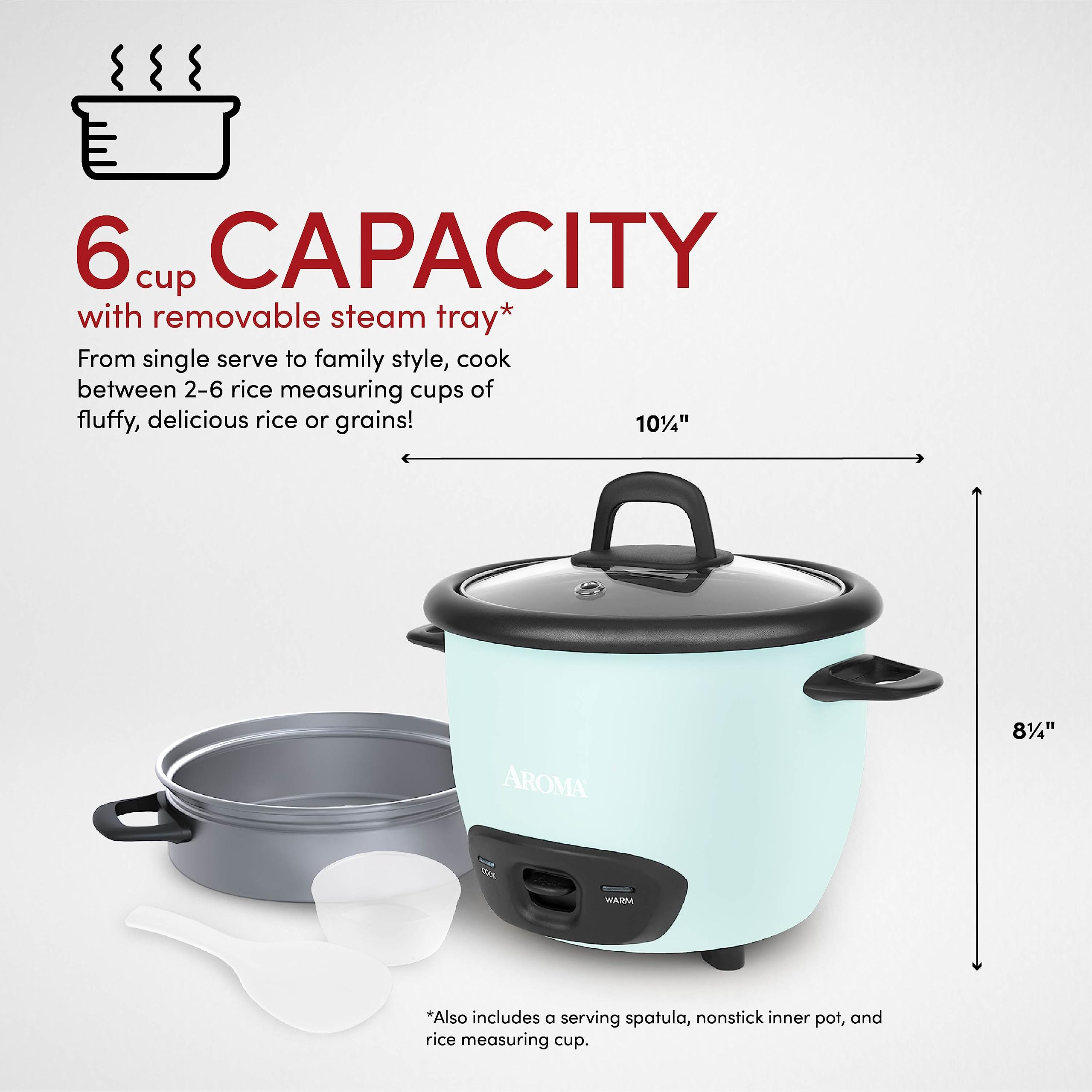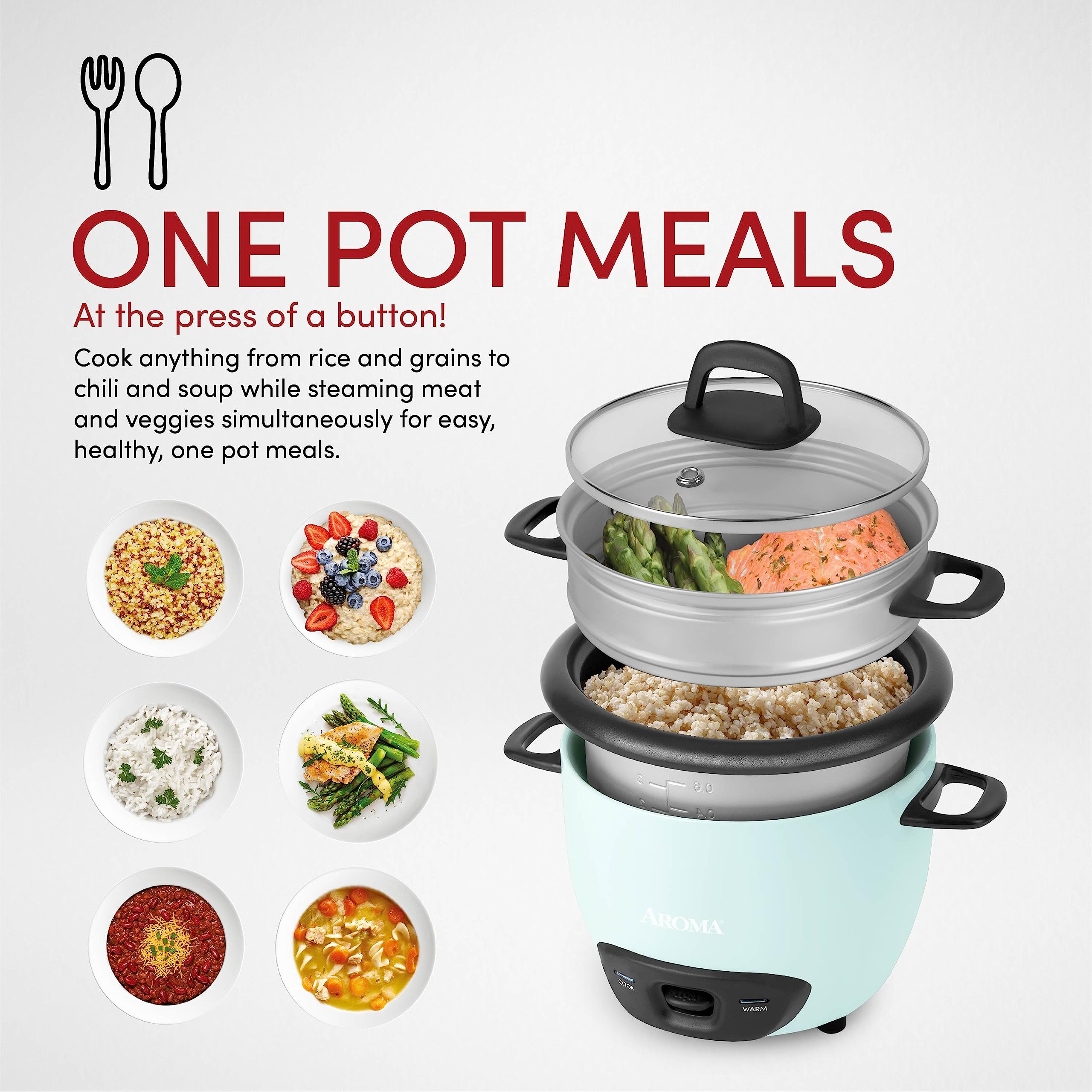 Enjoy easy home cooking with the Aroma® 6-Cup (Cooked) Pot-Style Rice Cooker & Food Steamer. Restaurant-quality rice. Healthy steamed meals. Delicious one-pot dishes. Prepare all this and more at the flip of a switch! Aroma takes the "cook" out of home cooking - turning kitchen time into your time! Help the kids with homework, get creative at play time or pick up that novel you've been waiting to dive into. All while delivering hot, hearty and healthy meals the entire family will love. This convenient cooker's compact capacity perfectly cooks 2 to 6 cups of any variety of rice. Once the rice has finished, it will automatically switch to Keep Warm so there's no need for monitoring or stirring. The included steam tray allows for healthy steaming of meats and vegetables, even as rice cooks below. It's also perfect for oatmeal, chili, jambalaya, soups and so much more! And when the cooking is done, the inner cooking pot and all accessories remove for easy cleanup in the dishwasher.