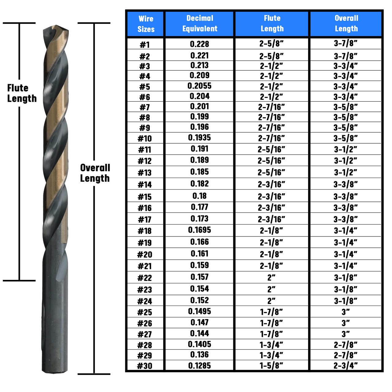 Drill America KFD series Killer Force Drill jobber length drill bit. Manufactured from premium grade High-Speed Steel. It has a heavy duty 135 degree split point for self-centering and reducing thrust. Gold and black surface treated for use in stainless steel and other hard metal drilling. High-speed steel tools are good for most general purpose applications, offering a combination of hardness and toughness for wear resistance. Round shanks allow use with a wide variety of toolholding systems. When run in a counterclockwise direction (right-hand cut) spiral fluted tools evacuate chips up and out of the cut to reduce clogging.