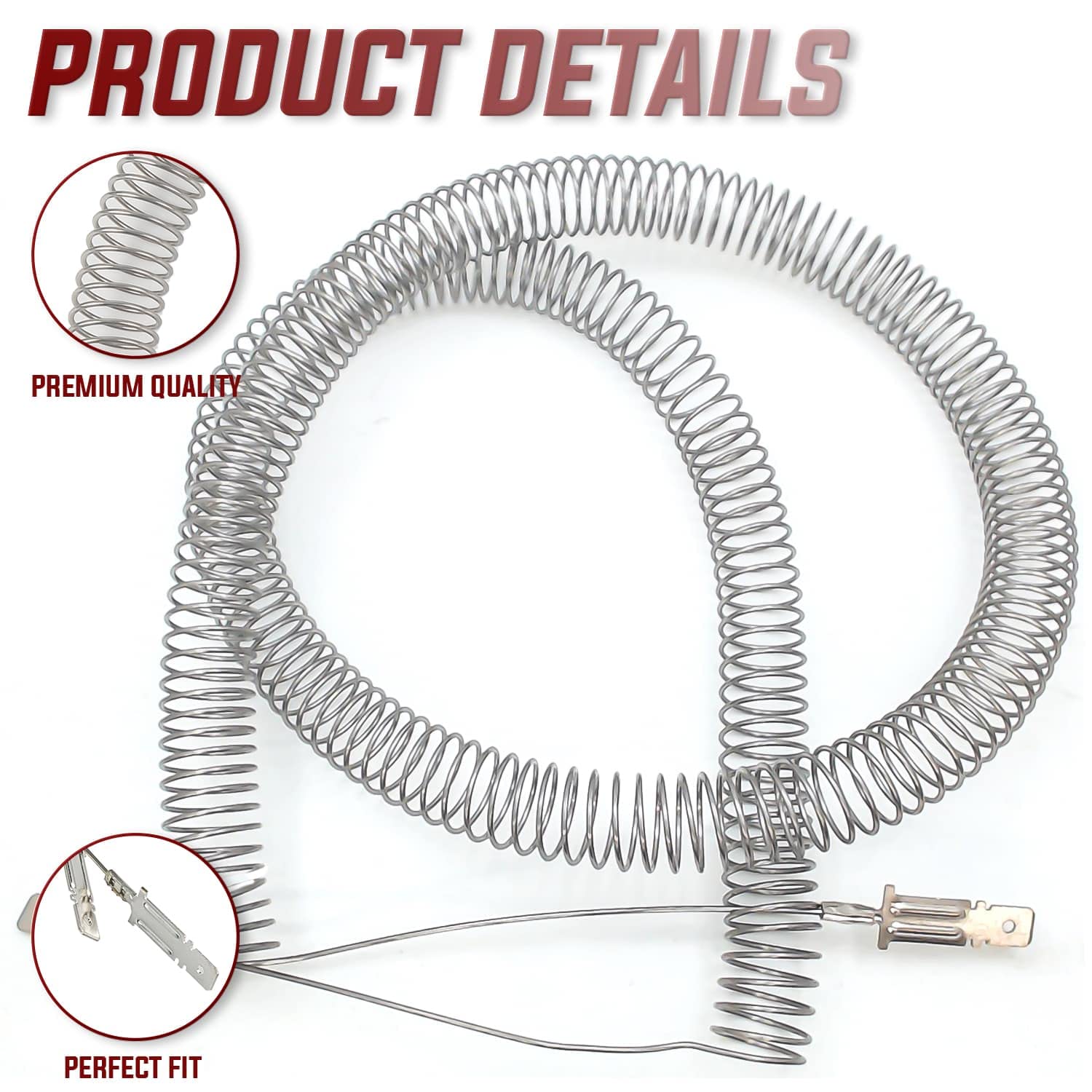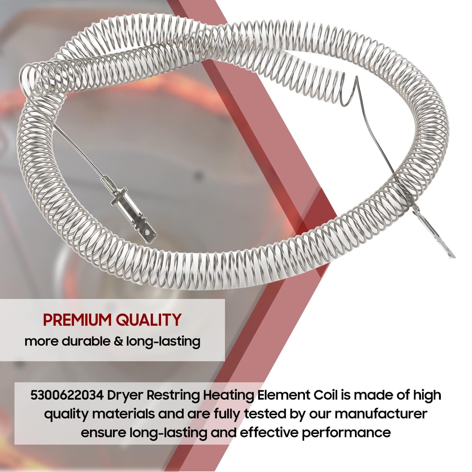 PRODUCT SPECIFICATIONS: The dryer's heat is generated by the 5300622034 Dryer Heating Element Restring Coil with 5/16 Inch Terminals, Rated 4600 Watts at 240 Volts. A noticeable break in the coil may indicate that a heating element is malfunctioning. Before installing this part, turn off the power. To safeguard your hands, put on work gloves.
