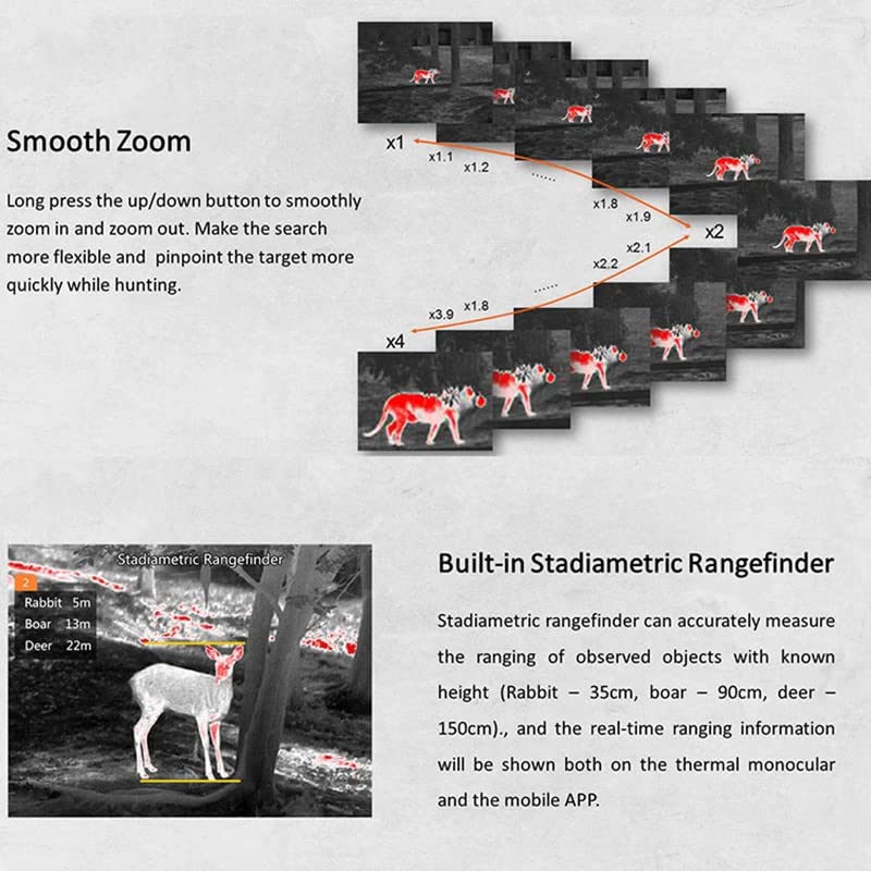Smooth Zoom and Flexible Search Press the Up/Down button for a while to get the performance-leading zoom abilities. It puts 4x more pixels on scene to locate the target fast.Stadiametric Rangefinder with High Accuracy TrackIR 25mm measures the distance of objects with known height. Take a rabbit (35cm), a wild boar (90cm), and a deer (150cm) as reference.