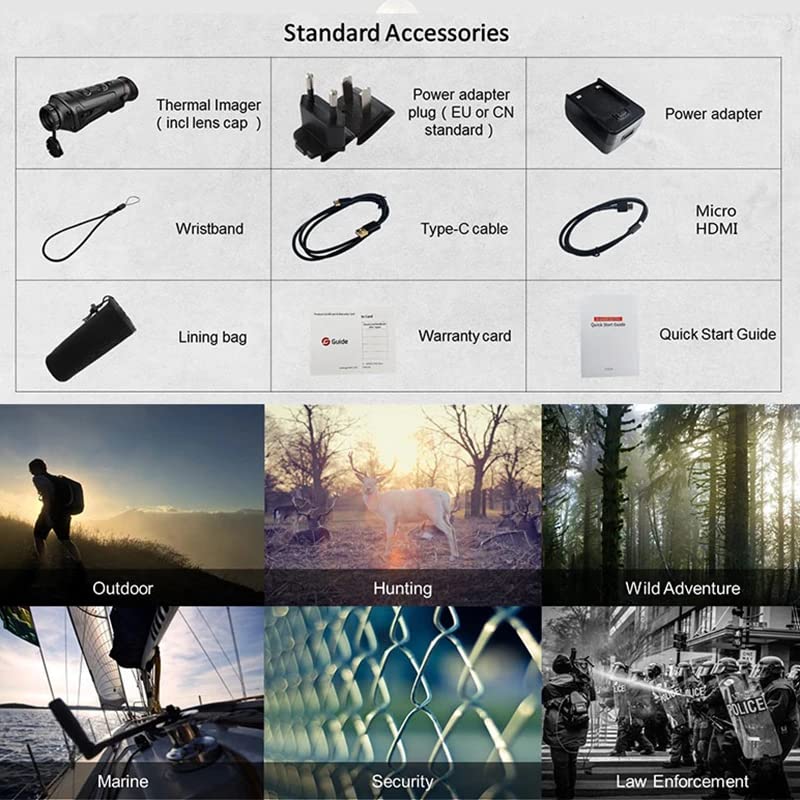 Features 1280×960 HD display for better comfort of viewing 640×480@12um sensor ensures superb image Support smooth zoom Can connect external accessories such as laser rangefinder, lighting, power bank and etc Build-in stadiametric rangefinder User-friendly Ul with quick menu, easy to operate Multiple Color Palettes for good vision in diverse environments Rugged and adaptable,IP66,1-meter drop test