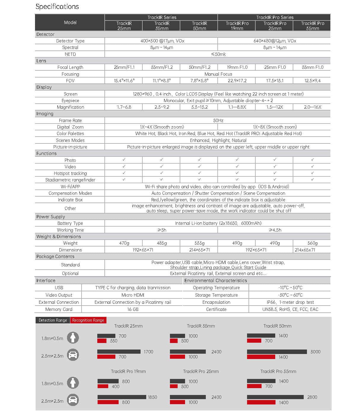 Guide TrackIR 25/35/50, TrackIR pro19/25/35 Handheld Thermal Imaging Monocular:With 1280x960 HD display, it provides adaptable and excellent thermal imaging, Support smooth zoom, built-in stadiametric rangefinder, image quality adjustment, picture-in-picture functions. At a high frame rate of 50Hz, TrackIR captures sharp thermal imaging throughout dynamic and rapid motion in distance.