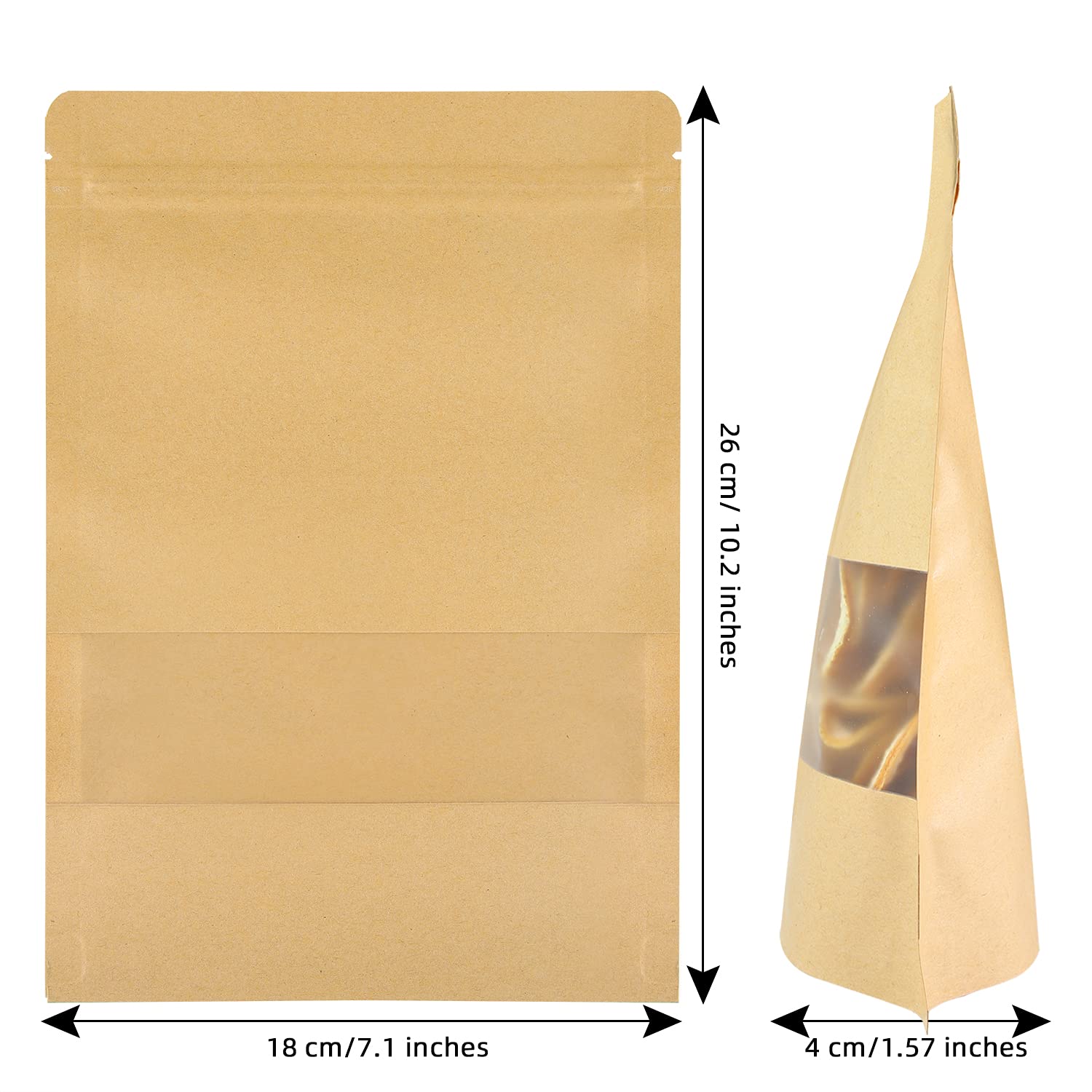 STAND-UP KRAFT BGAS WITH CLEAR WINDOW - You will get 100 Pcs kraft pouches with clear window, allows you to check the food situation easily, the zipper bags can heat sealable, you can heat seal the open top section above the zipper for extra protection.