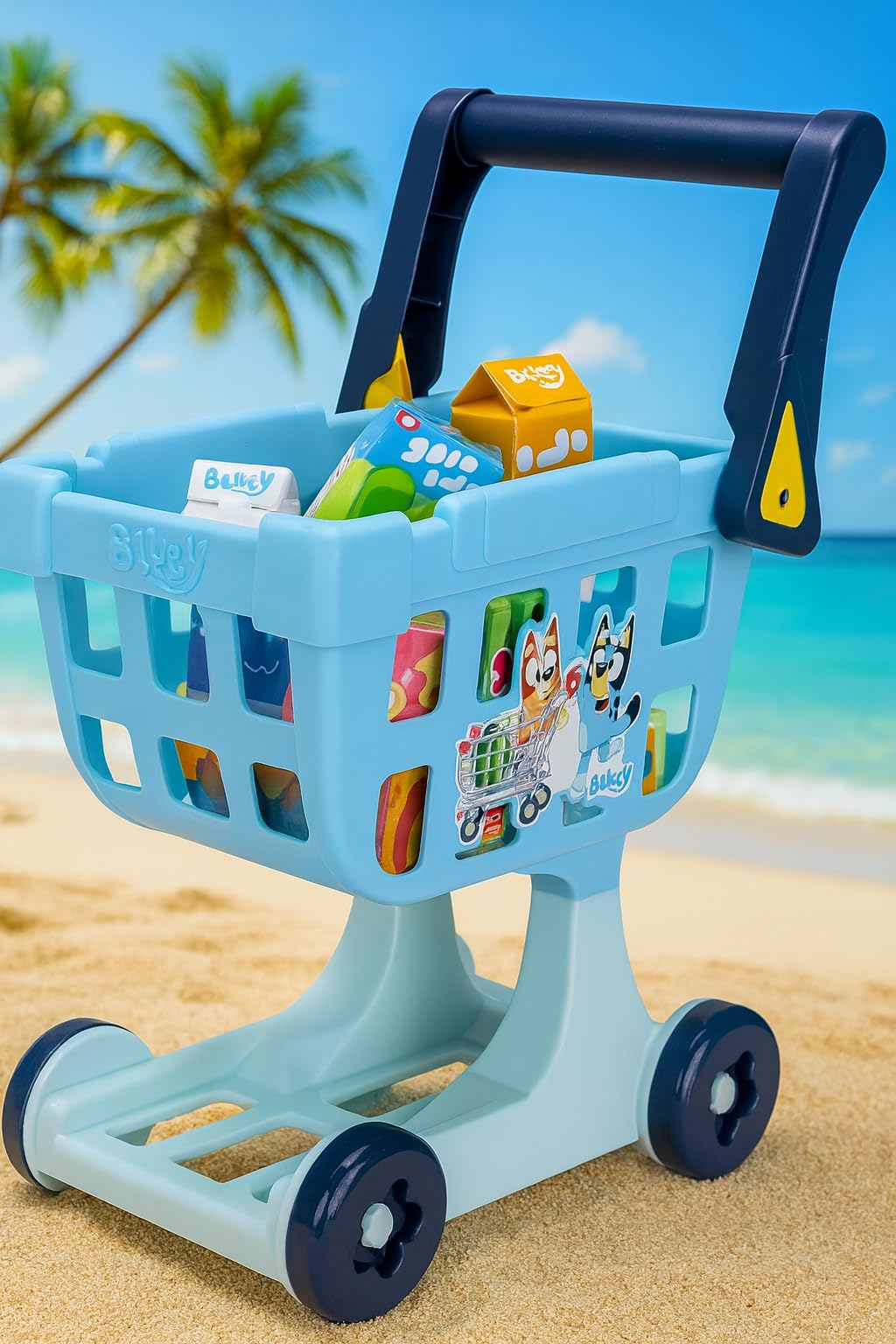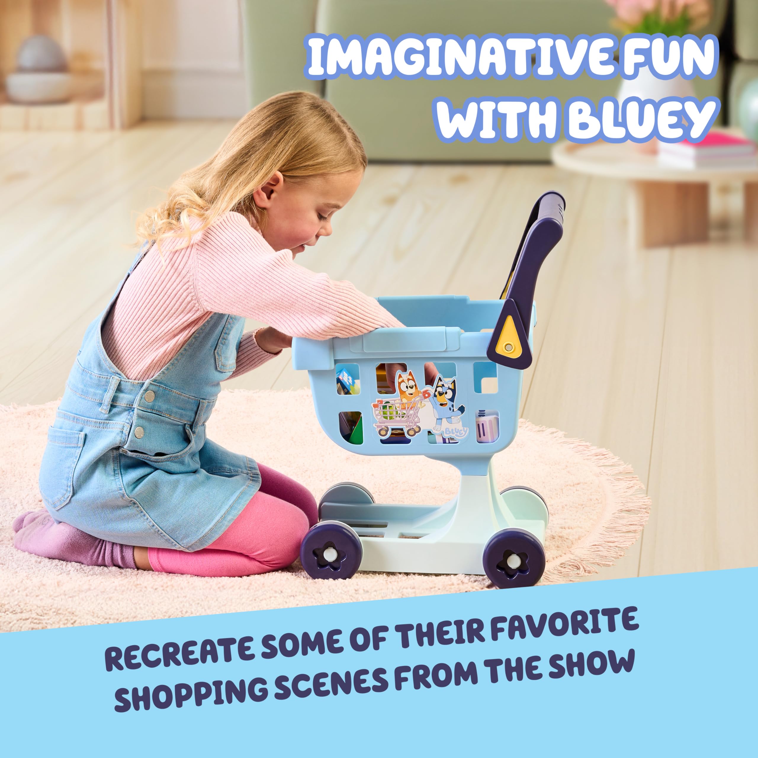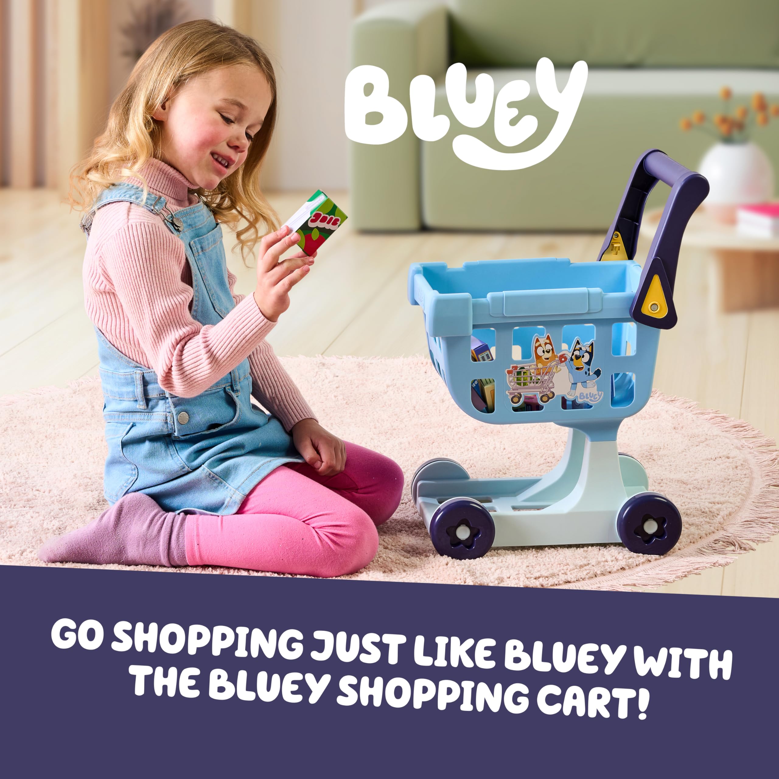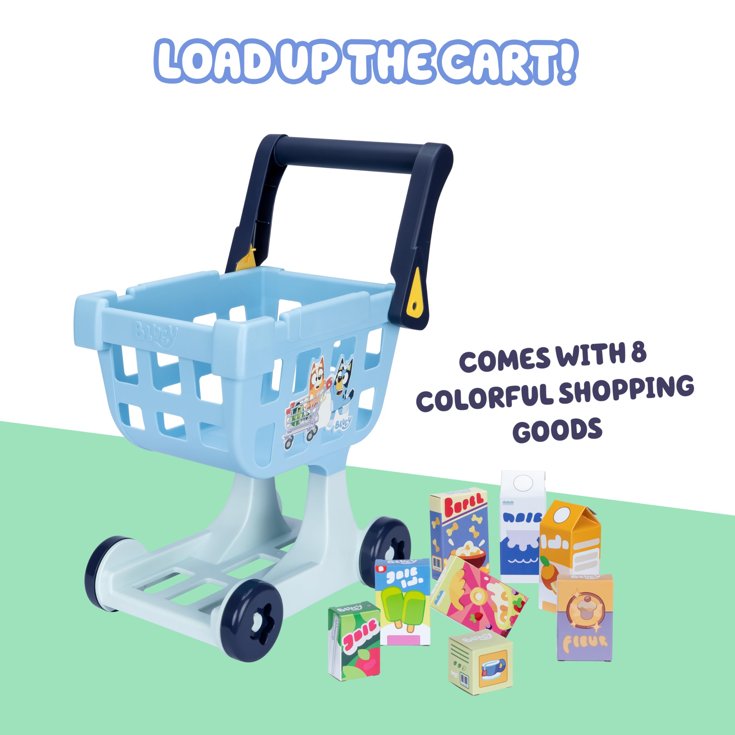 Shopping Cart Trolley: Get ready for a shopping adventure like Bluey and Bingo with our toy shopping cart; this play shopping cart comes with 8 colorful cardboard grocery items so kids can fill their cart and enjoy a realistic shopping spree