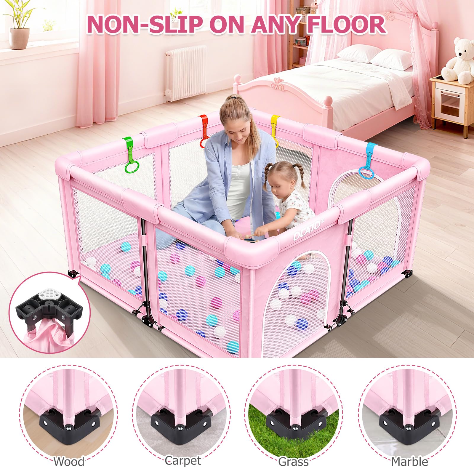 NON-SLIP ON ANY FLOOR: Non-slip base provides further stability. Suitable for any floor, such as wood, carpet, grass, marble, etc. Baby play yards maintain stability when baby is excited. For indoor and outdoor use, including home, park, grassland, beach. Spacious outdoor baby playpen that can accommodate multiple toddlers and parents. A quick pop up and lock system, four sizes complete, great toddler gifts play pen for toddlers 1-3 years, amazing chose for new parent