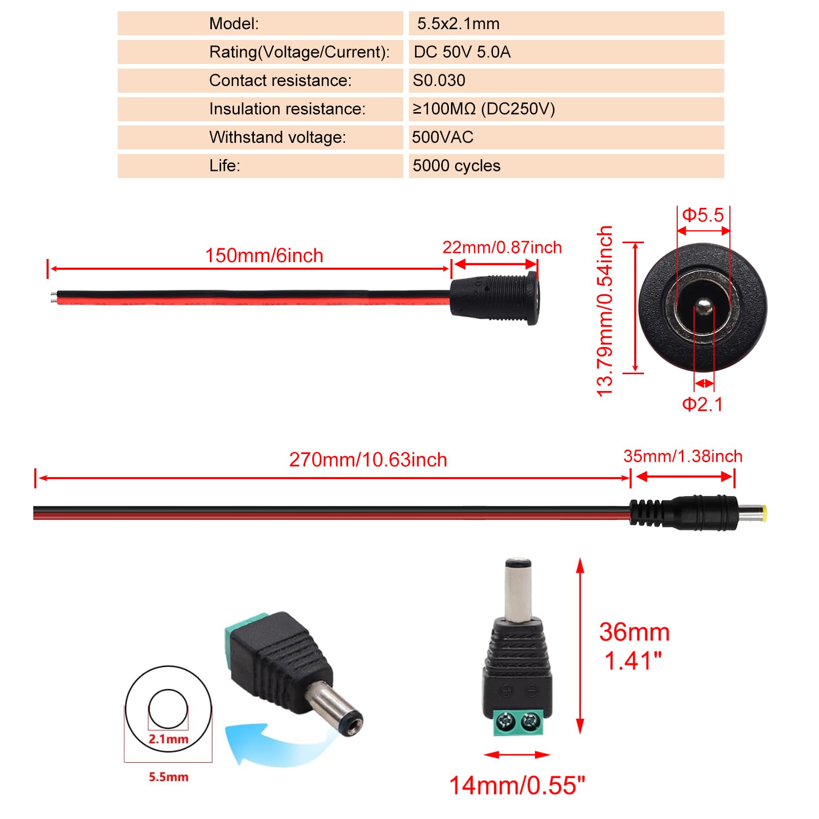 Model: 2.1 x 5.5mm Socket.The DC female seat is a copper pin, and the transmission is fast and stable.Pre-soldered Wires Length:150mm,red & black wire jackets indicate polarity;Rated load: 30V DC 10A.