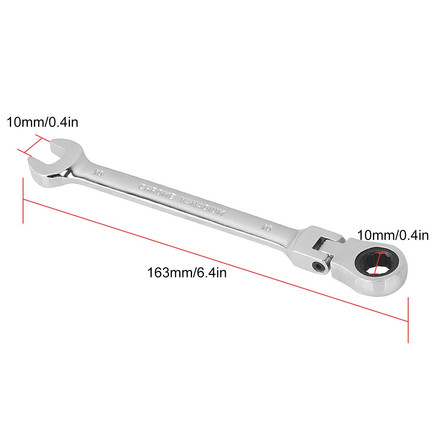 Abuff 3 PCS 10mm Ratchet Wrench, Metric Ratcheting Wrench Set with 5° Movement and 72 Teeth for Projects with Tight Space The Ratchet Wrench is crafted with high hardness and toughness, heat treatment and chrome finish, to ensure a long-lasting performance and provide convenience to your repair work. Our extra precise ratcheting wrench is faster to use in tight spaces than a standard wrench, because it allows you to have continuous engaged with the bolt while you tighten it. Reseating bolts in tight, dark spaces kills your productivity. Made of industrial grade high-carbon steel which is heavy duty and heat-resistant Polished surface with chrome finish makes it bright, rust-resistant and corrosion-resistant Double ended with 72-teeth design for speeding up your project and full drive box for eliminating rounding 5-degree working swing arc for turning to ensure easy access Specification Item: Ratchet Wrench Material: grade high-carbon steel Quantity: 3 Pcs Color: Silver Inner Diameter: 10mm Surface Treatment: Polished Chrome Plating Application Range: Machine Repair, Production Workshop etc Package Included: 3 x 10mm Ratcheting Wrenchs