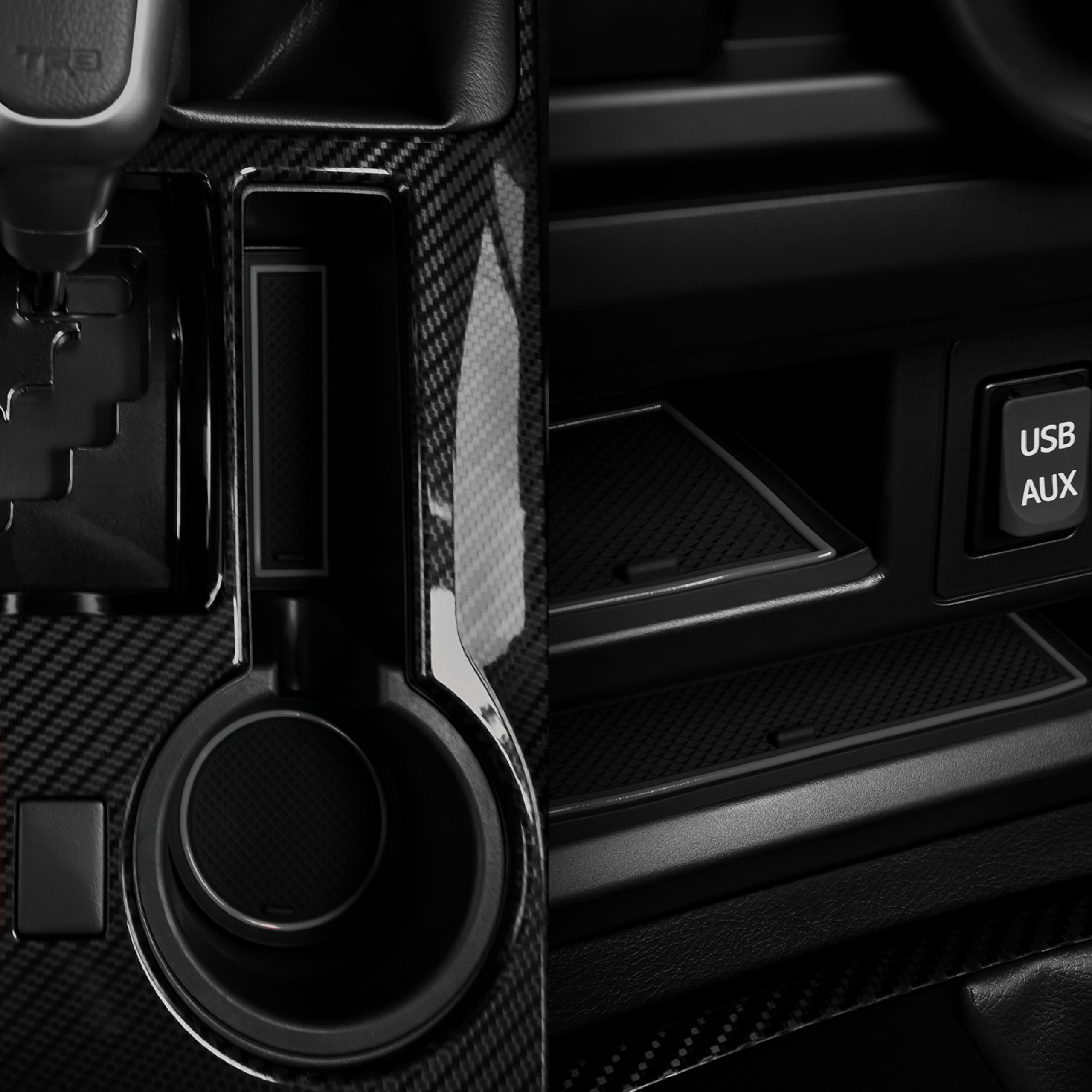 ✅NEW CAR LUXURY THAT LASTS - Our custom 4Runner compatible car interior liners and cup holder mats are engineered in the USA with a unique design that offers a precise fit you won't find elsewhere, perfectly placed tab handles for easy removal, a sleek mods look without logo designs that gather grime, and a patented all-weather material that withstands heat up to 170 degrees without the “rubber tire” smell