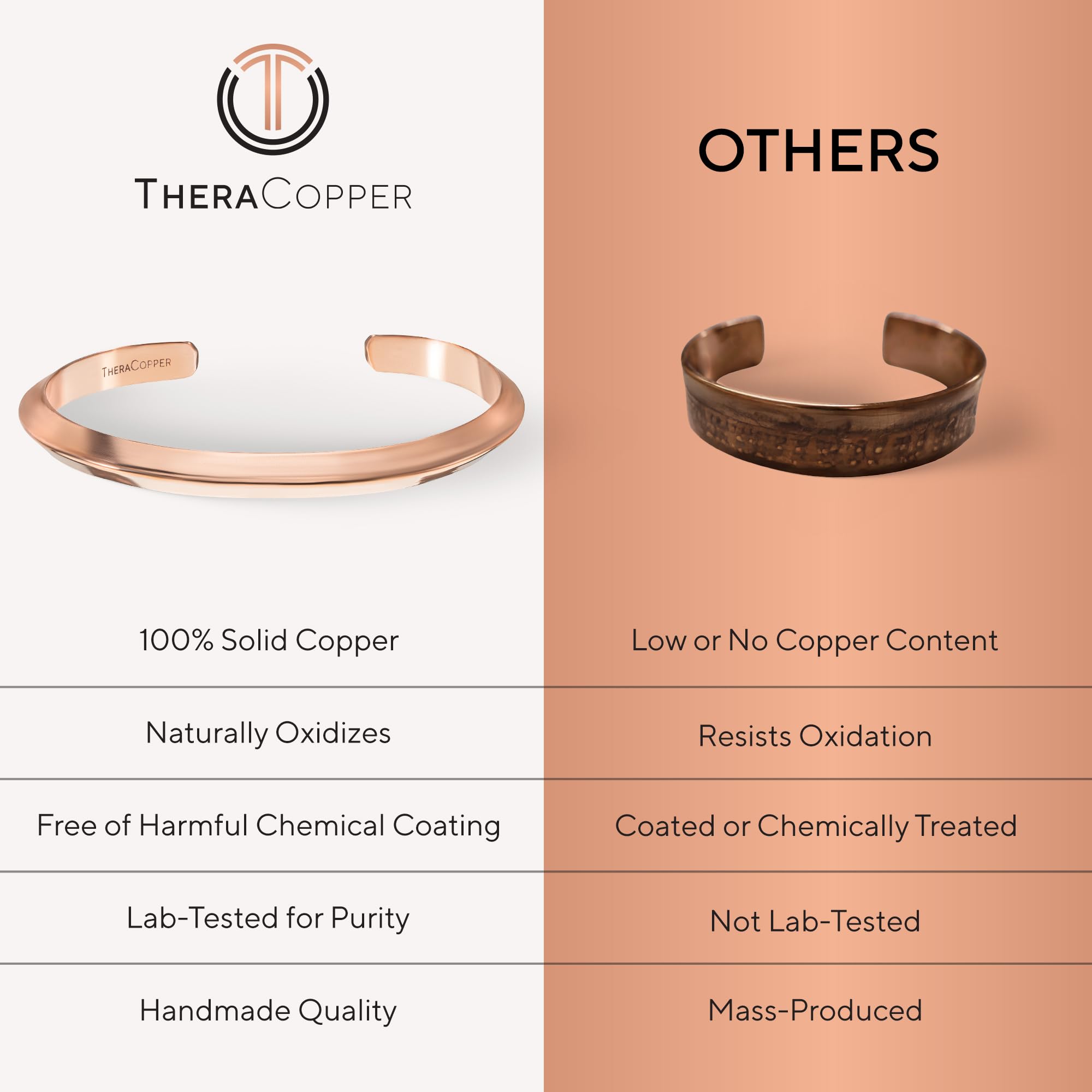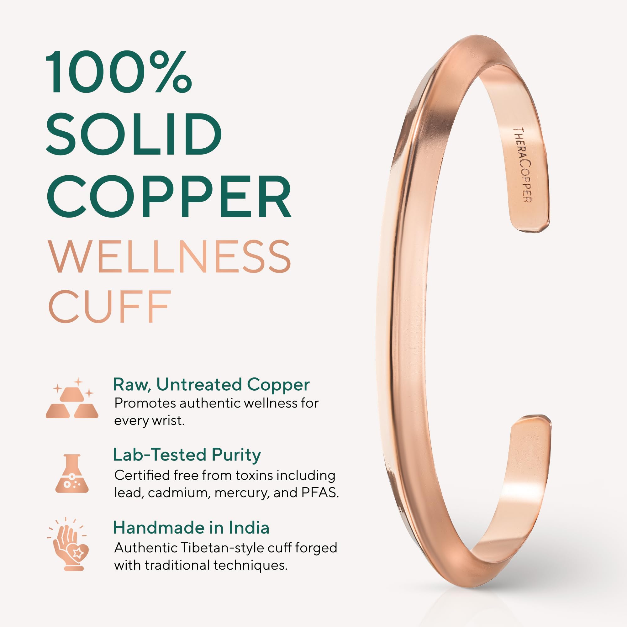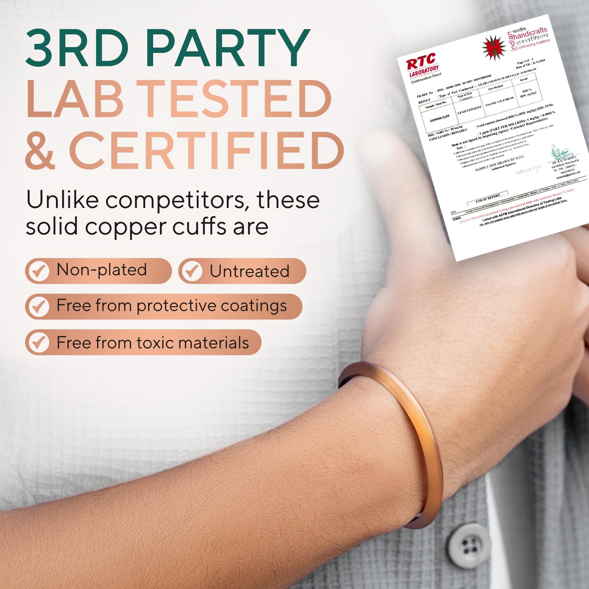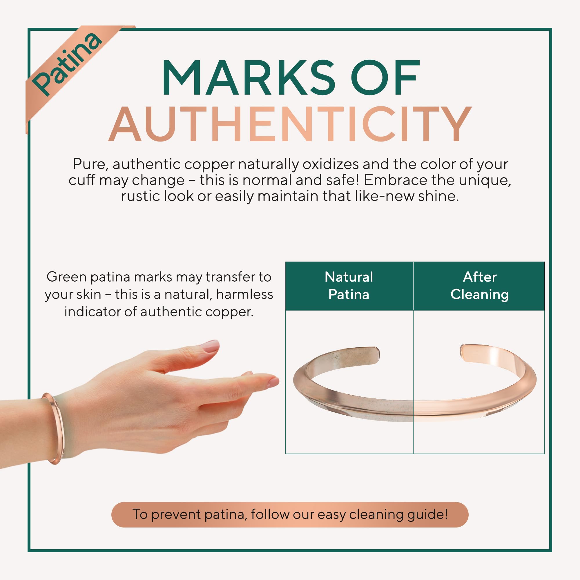 THE PUREST COPPER: Handcrafted with 100% pure copper, our real copper bracelet is lab-tested and certified free from harmful metals like lead, nickel, cadmium, and PFAS. Many alternatives use cheap, mixed copper or plated bracelets with toxic coatings—TheraCopper is completely natural, untreated, and safe. Over time, your pure copper cuff bracelet will develop a natural patina, a hallmark of authentic, untreated copper—not a defect. Simply restore its original shine with salt and lemon juice or any copper cleaner.