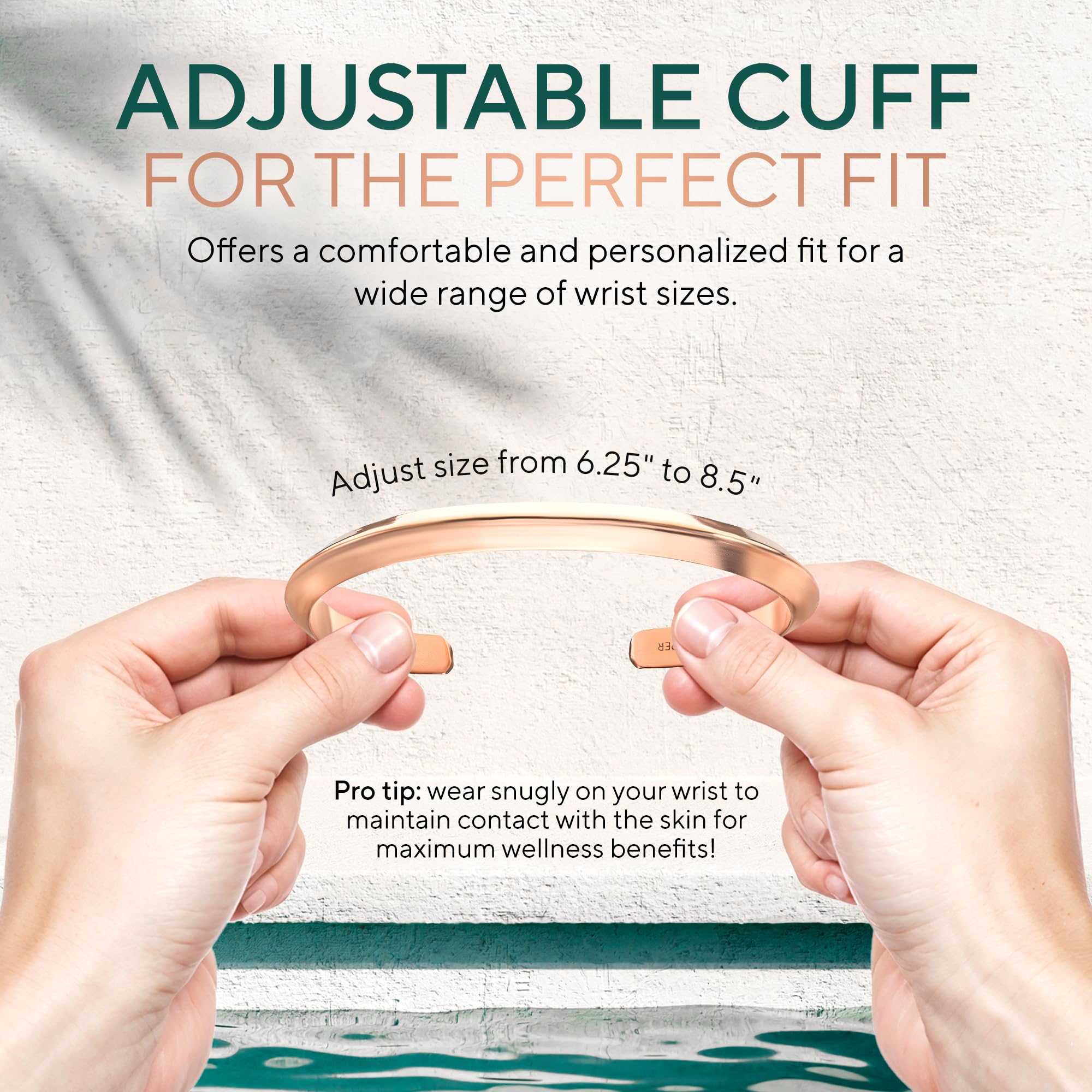 ADJUSTABLE FIT: Designed for all-day comfort, our open-cuff copper bracelet easily adjusts to fit wrist sizes 6.25" to 8.5" (SMALL to X-LARGE). Whether it's a womens or mens copper bracelet, the customizable fit ensures a secure yet comfortable feel without compromising style. A perfect choice for those who appreciate the timeless charm and wellness benefits of real copper jewelry for women and men.