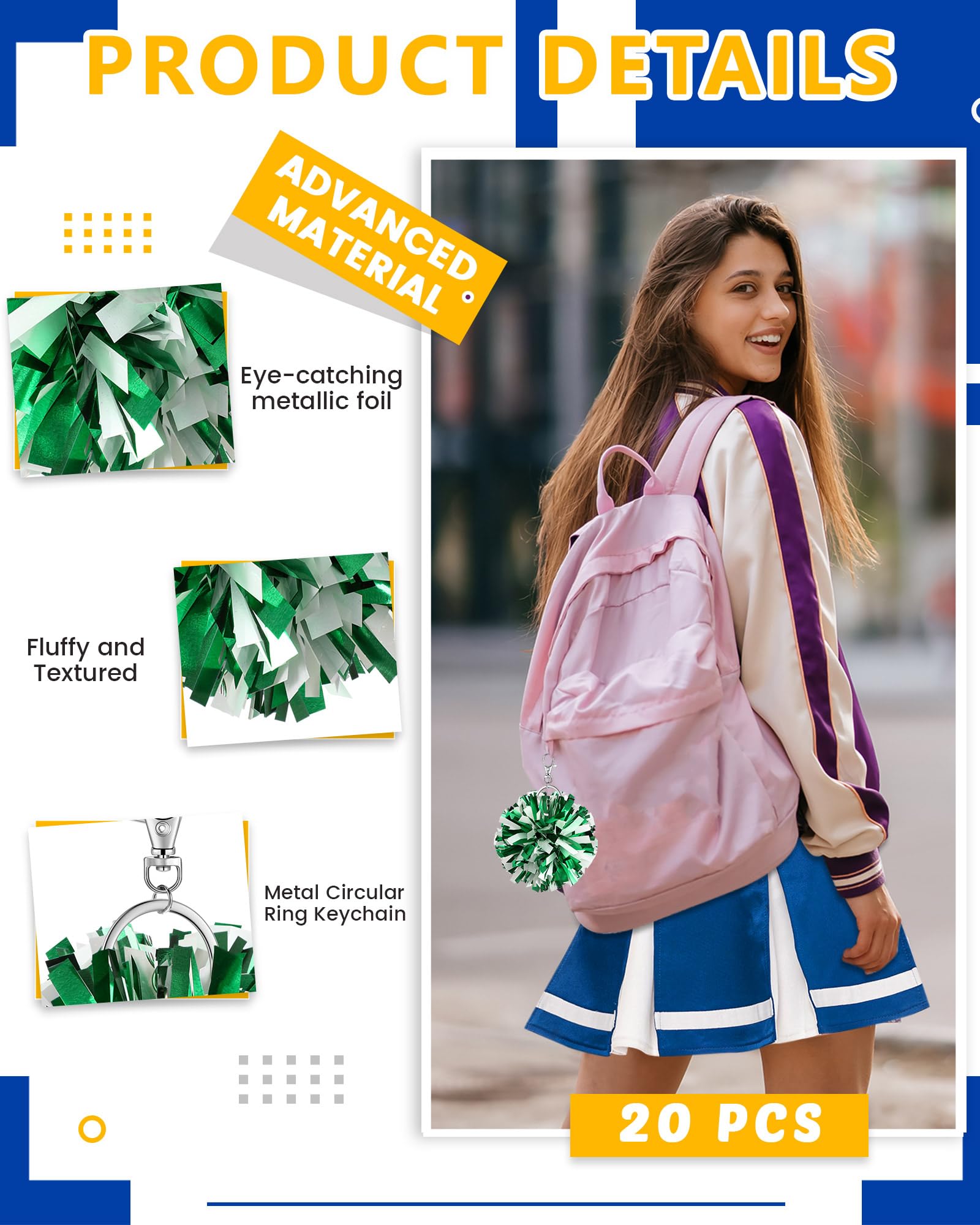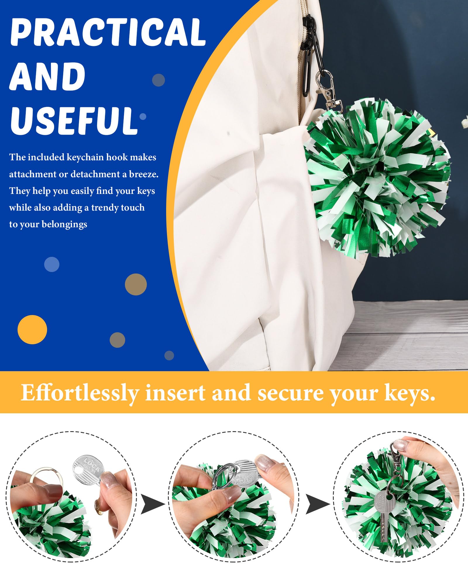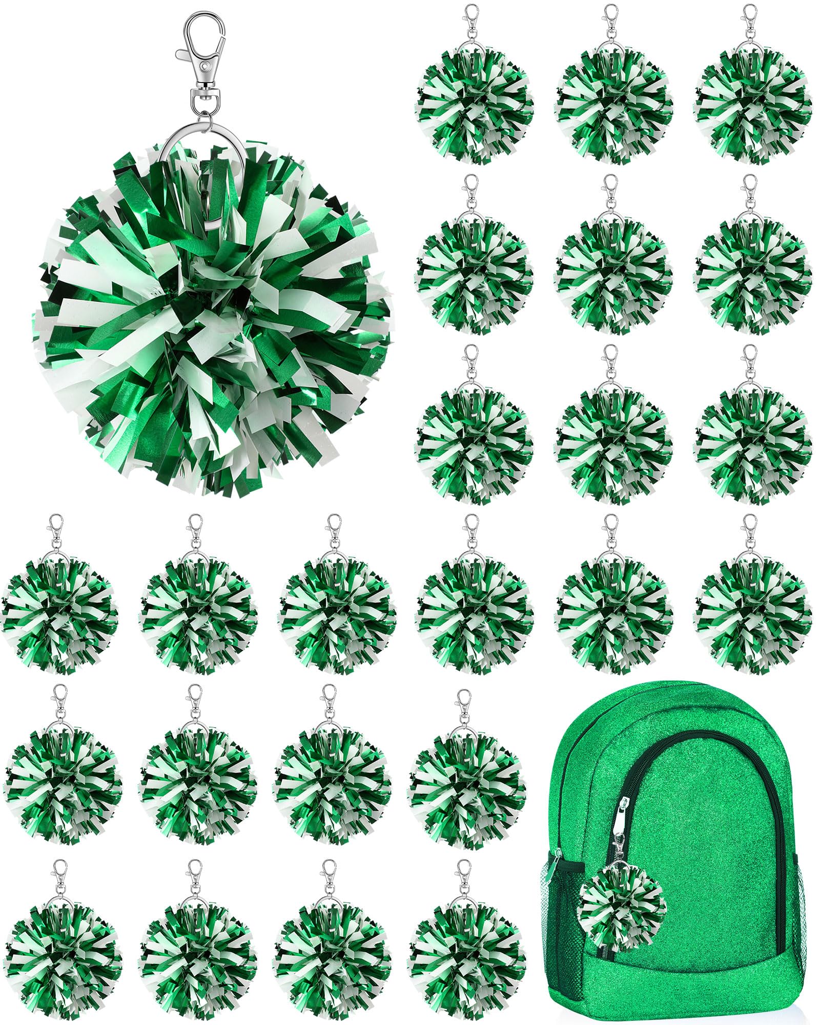 Sturdy Material and Vibrant Colors: these pom pom keychains are made of quality plastic and metal for durability, and feature nonfading, shimmering green and white foil; They catch the eye, boost cheerleading spirit, and show your strong support for the team