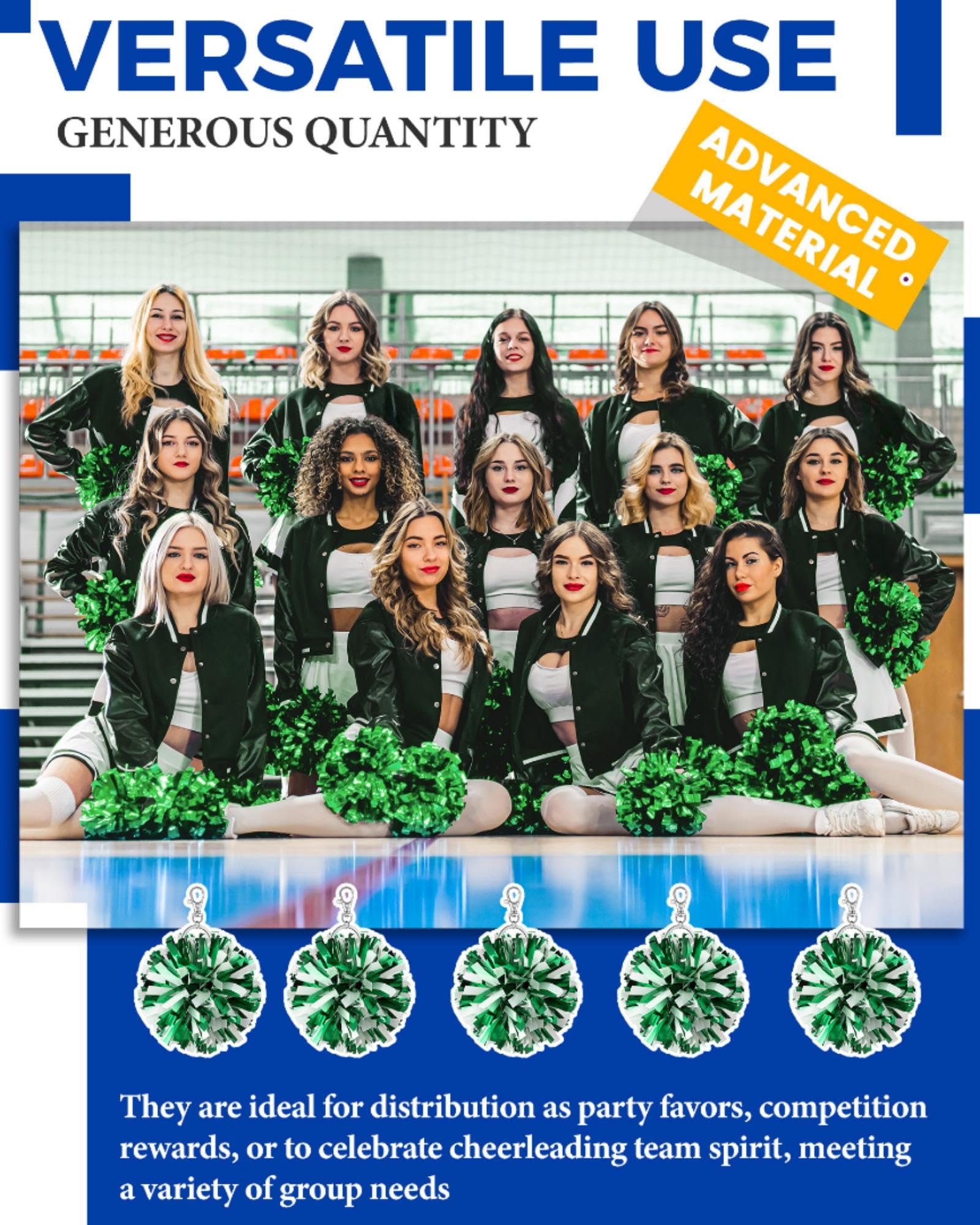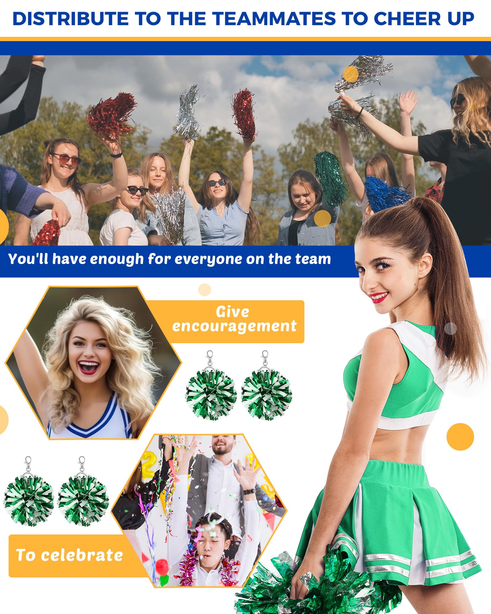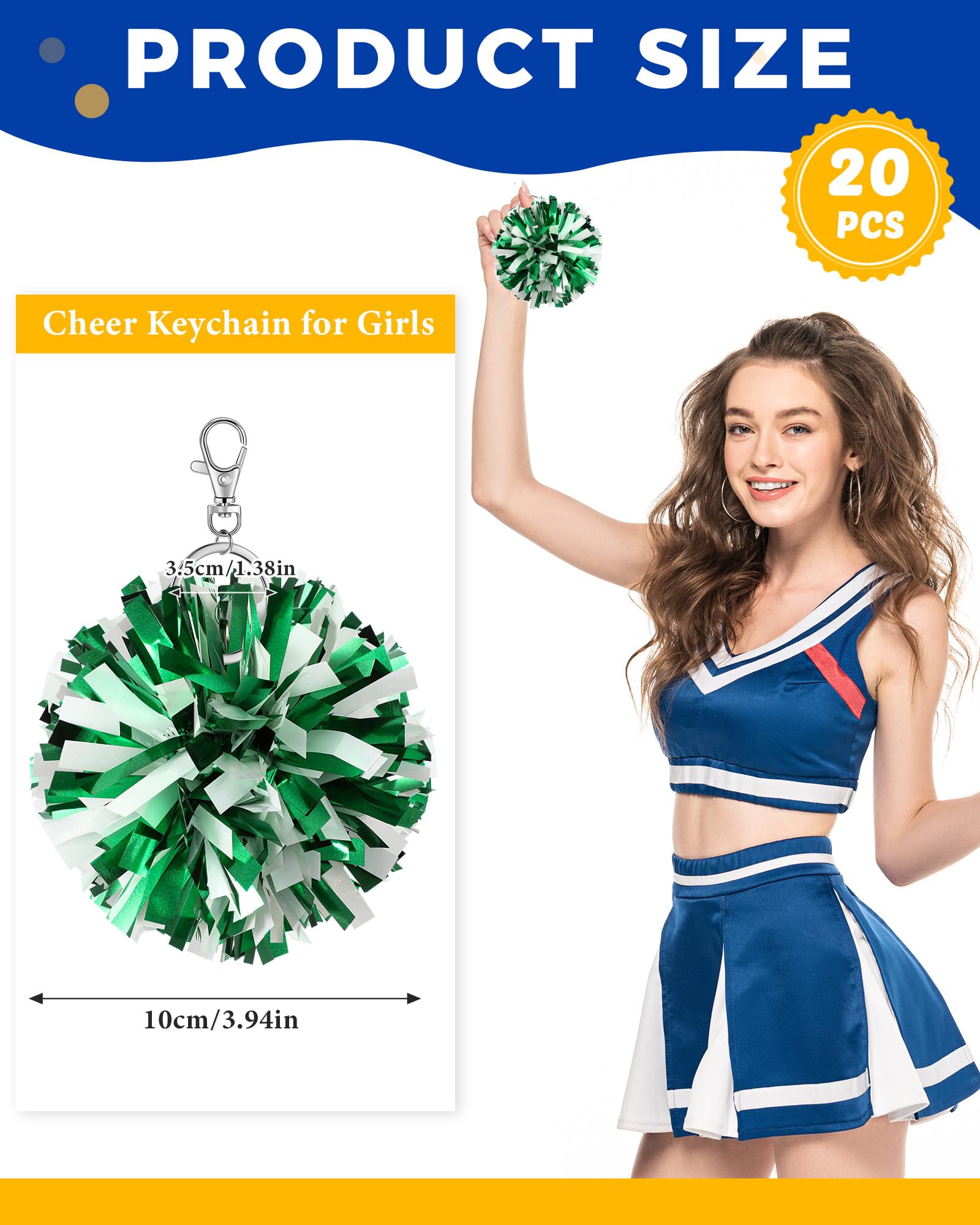 Sturdy Material and Vibrant Colors: these pom pom keychains are made of quality plastic and metal for durability, and feature nonfading, shimmering green and white foil; They catch the eye, boost cheerleading spirit, and show your strong support for the team