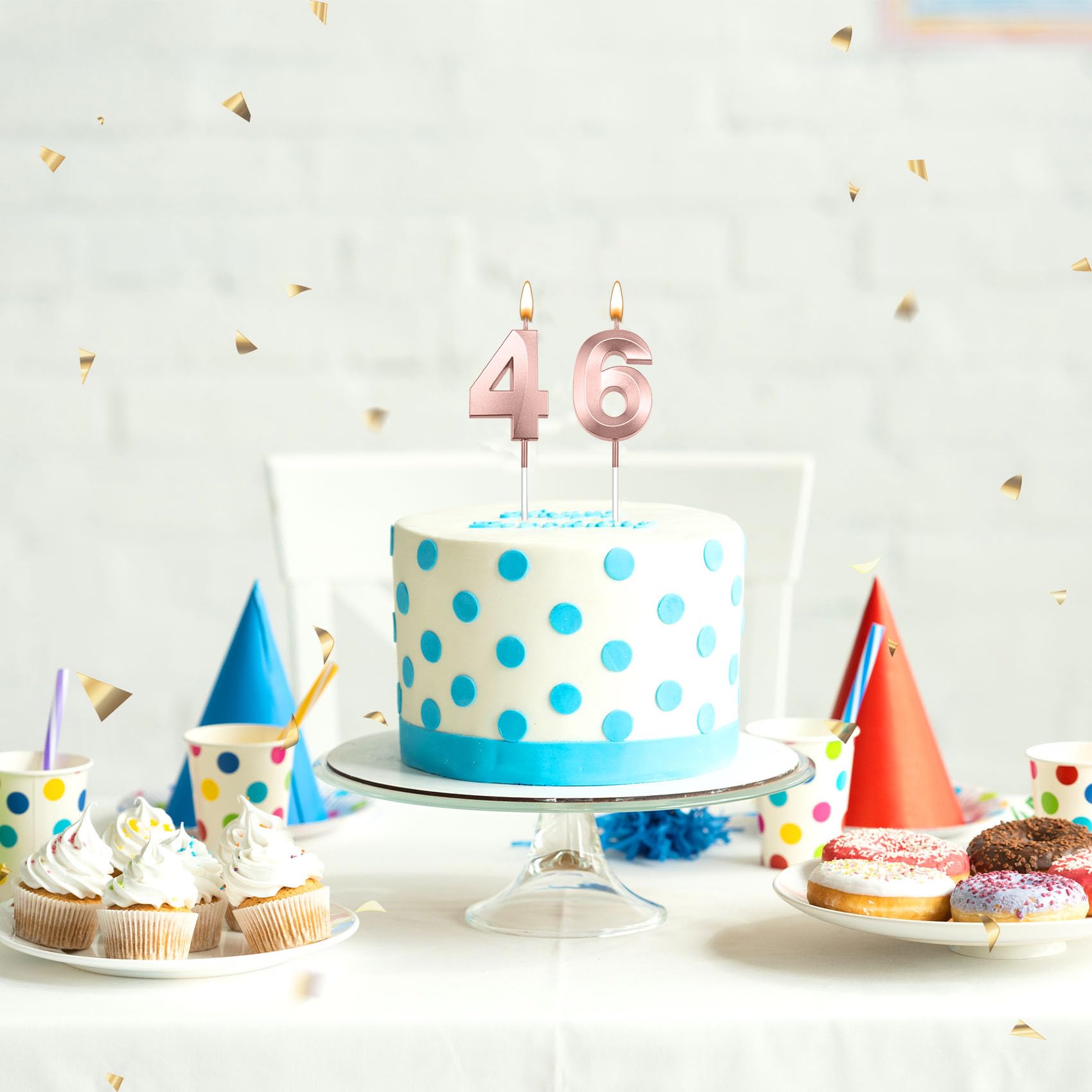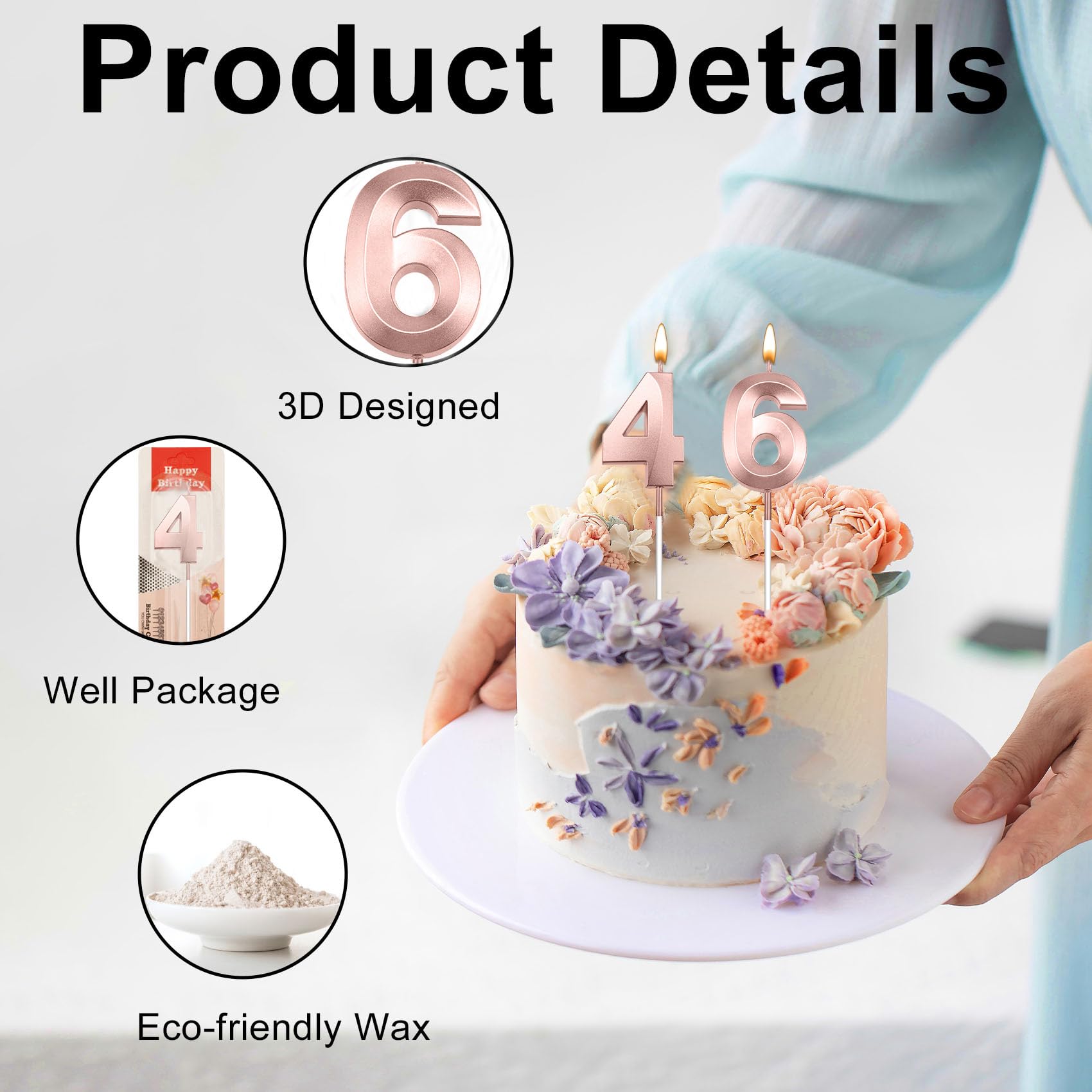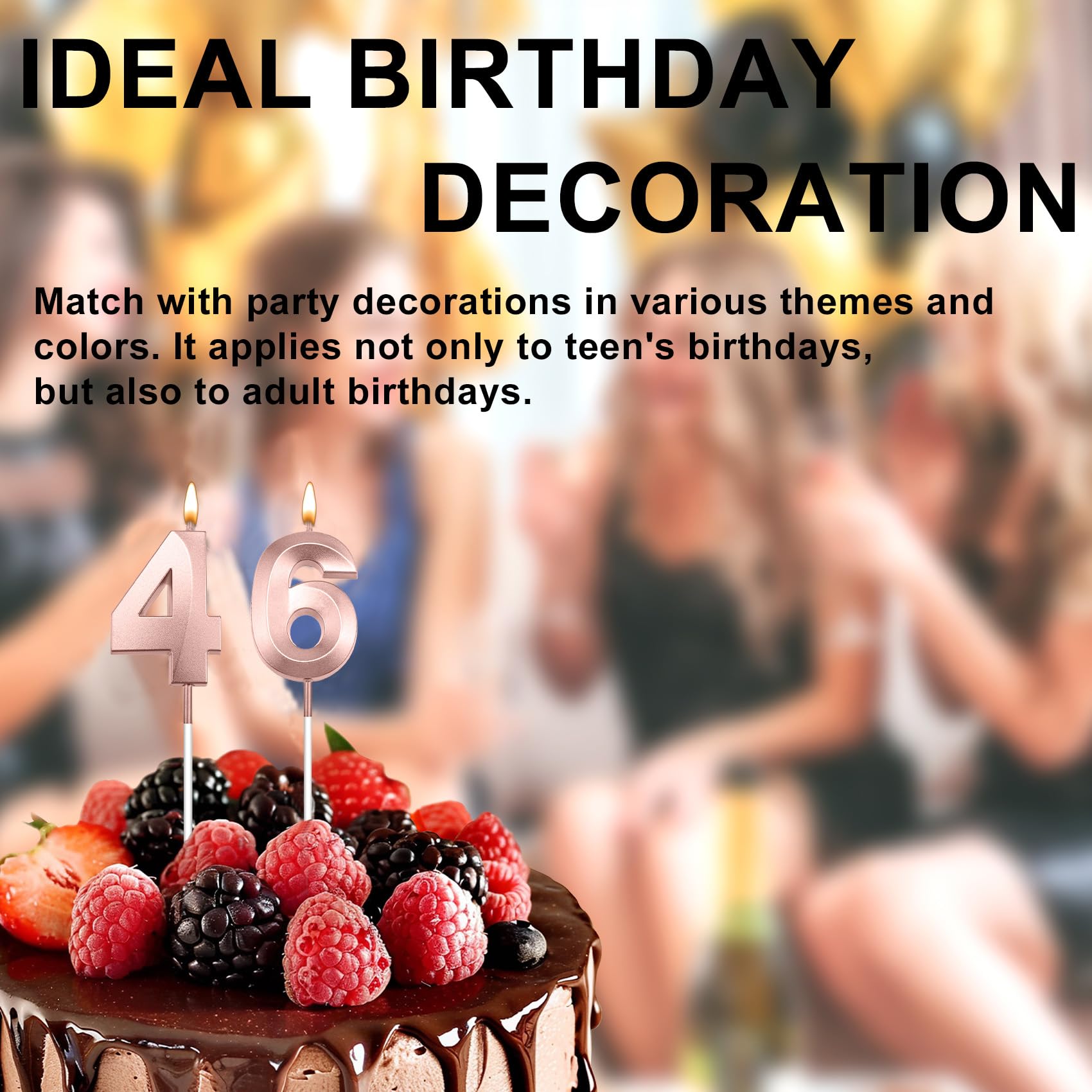 Vibrant 3D 46 candles for cake: Package contains two matte-rose gold birthday candles for cake —featuring number 4 candle and number 6 candle —that together form a sparkling "46" or"64" display. In low lighting, 46 cake topper add a elegant glow, making them perfect for decorating cake, cupcakes, and desserts. A wonderful way to help create memorable birthday moments. number birthday candles 46th birthday gifts for women 46 birthday decorations for him happy 46th birthday party favors