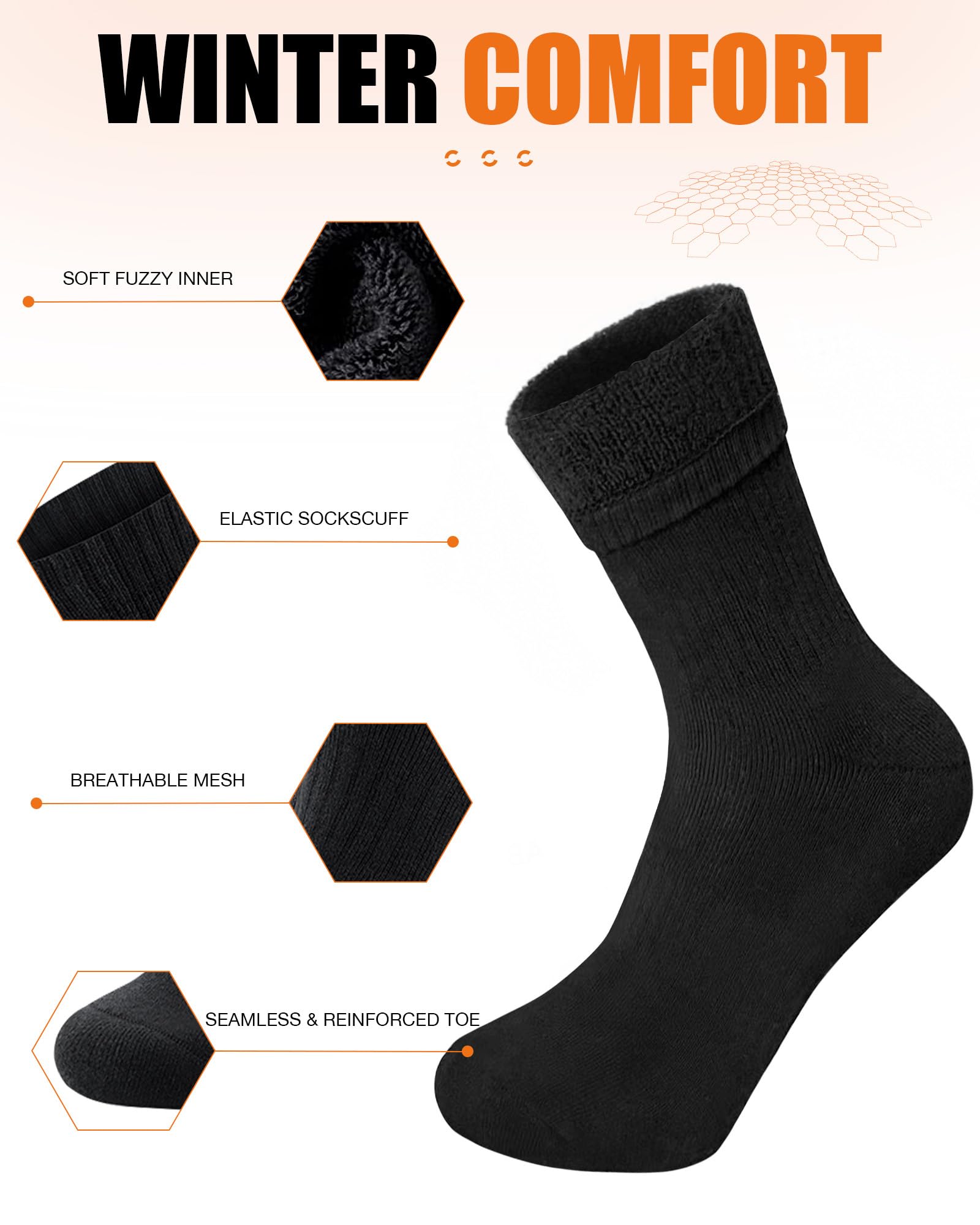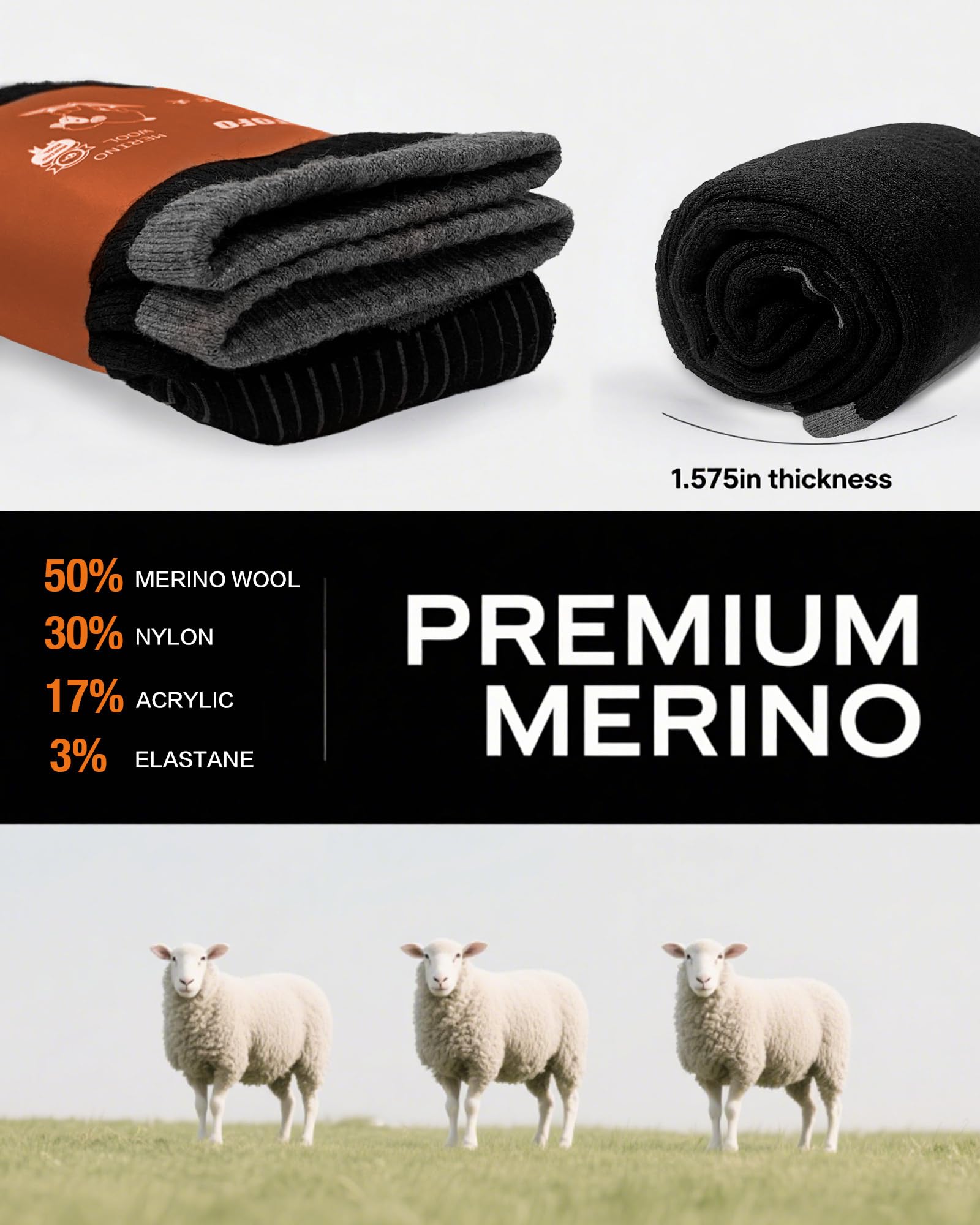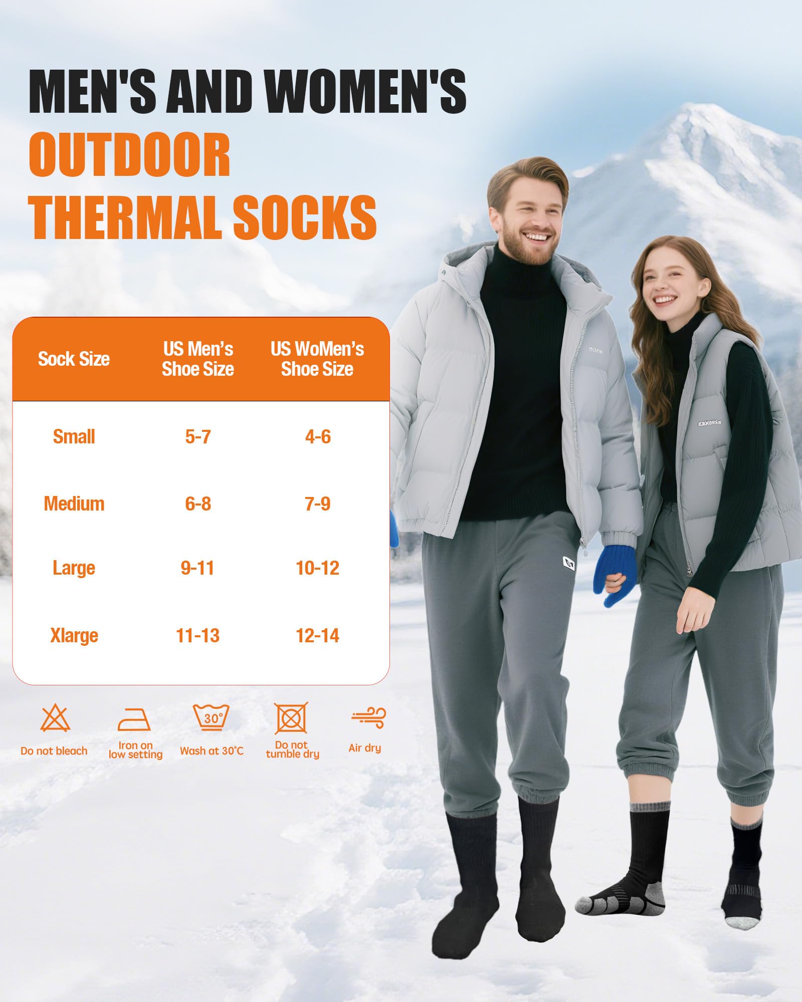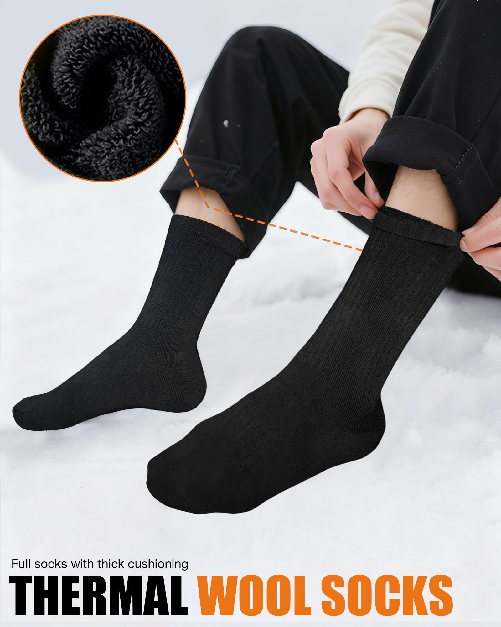 Versatile Wear: Our winter warm merino socks feature versatile performance, ideal for temperatures between 30°F and 70°F (-1°C to 21°C) across various environments. Perfect for hiking, camping, skiing, and outdoor adventures, these men's merino wool socks are equally suited for work boots, winter sports, and everyday wear—delivering reliable comfort and performance in any setting