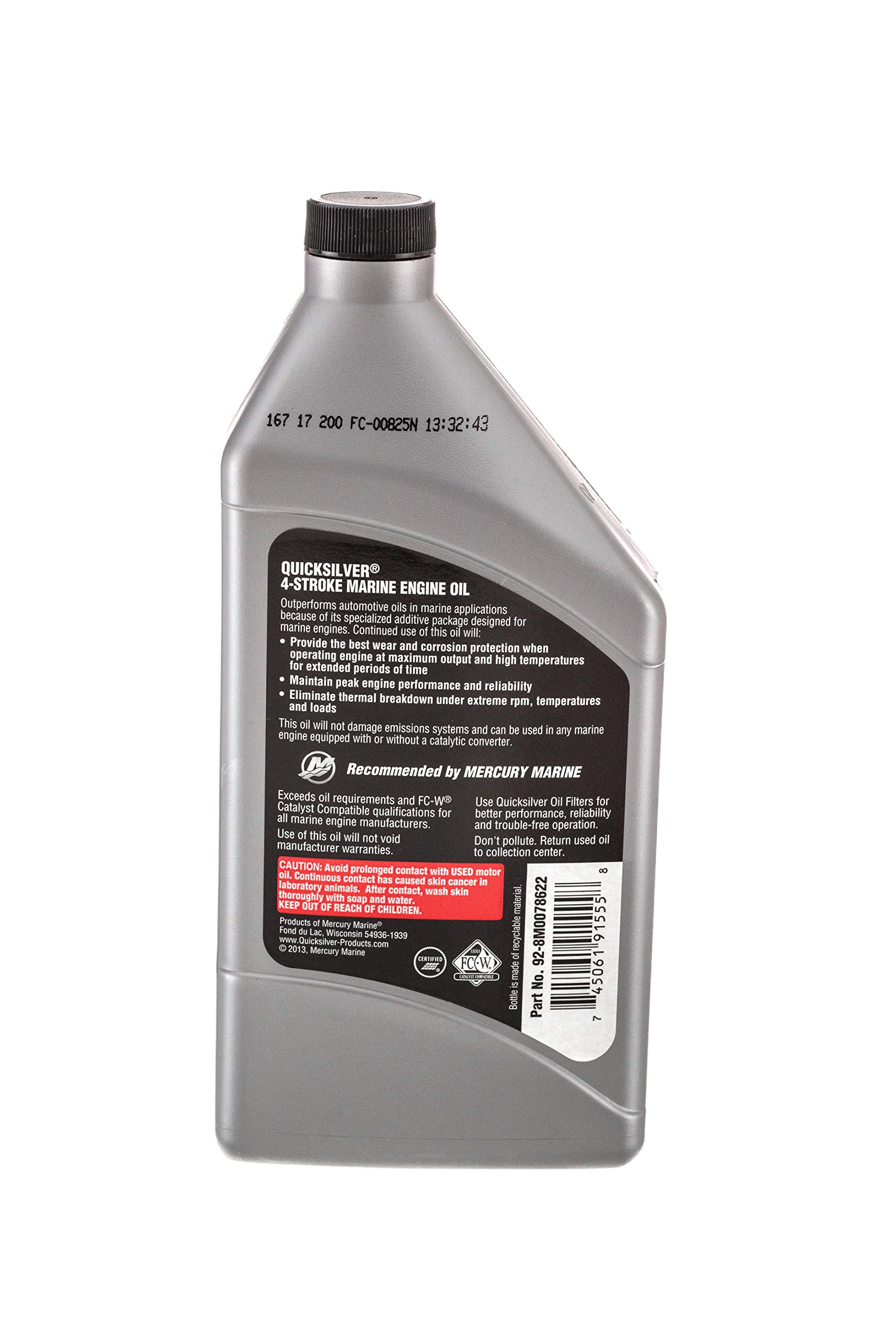 Clean oil is essential in reducing friction and preventing damage to internal components, providing many years of engine life. Engineered for sterndrive and outboard applications, this 4-stroke synthetic blend 25W-40 marine engine oil has been extensively tested to ensure impressive protection against corrosion and wear. Exceeds all marine industry 4-stroke oil requirements including FC-W and FC-W catalyst compatible. The Quicksilver brand is the leader in delivering uncompromising engine oils, parts and accessories to the marine industry for over 65 years. Quicksilver is the premier supplier of Mercury Marine original equipment replacement engine parts, oils, and accessories, but also works to serve all original equipment brands in the marine and powersports industries. It has earned a loyal following by providing the highest quality products that are tested through some of the most rigorous environments and testing procedures. No aftermarket company comes close to the level of research and design as Quicksilver; buying Quicksilver is buying performance, protection and peace of mind.