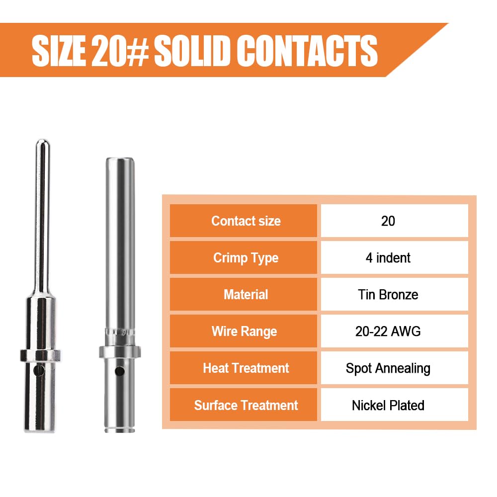 Deutsch Size 20 Solid Contacts: Male and Female terminals,54 pairs. The solid terminals have strong stability and conductivity, nickel plating also makes terminals resistant to corrosion and wear, easy to crimping with wire and installing into connector.