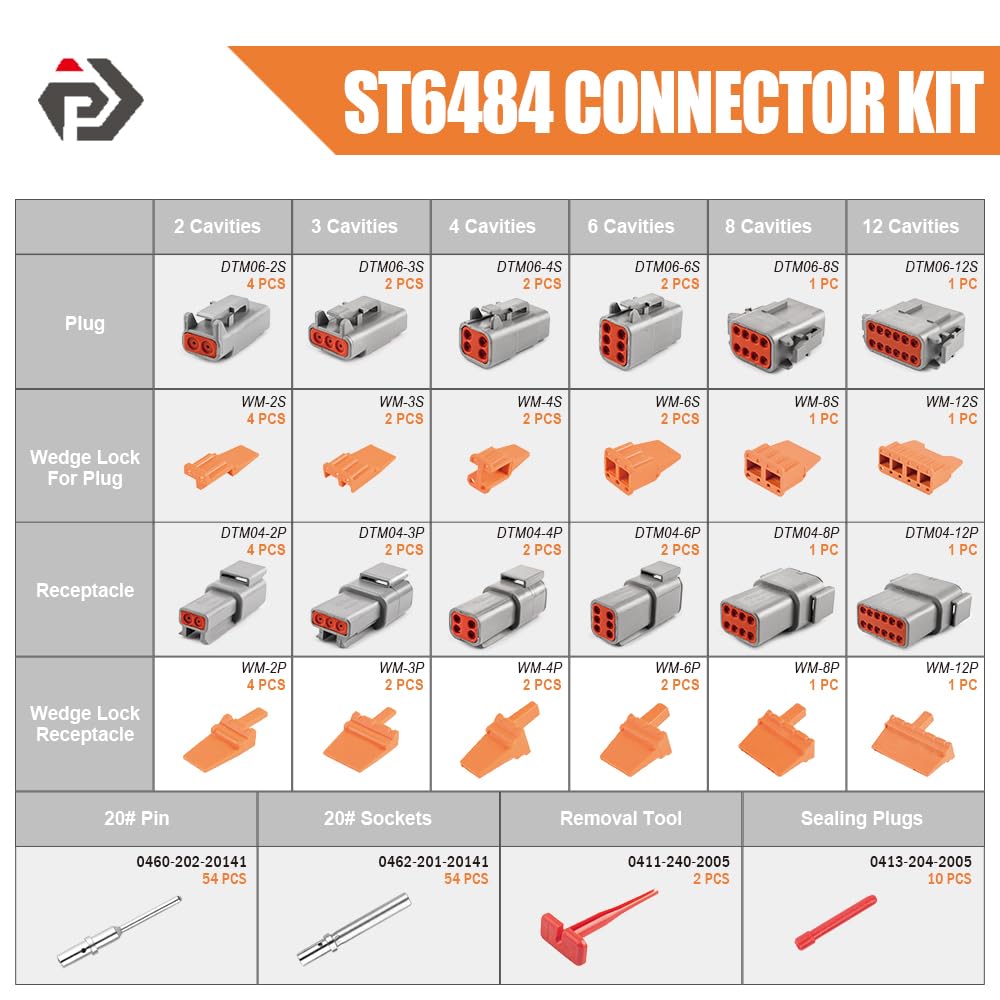 Deutsch DTM Connector Kit: DTM connectors and wedgelocks ranging from 2 to 12 cavities, size 20 pin/socket 20-22 AWG and size 20 pin/socket 20-22 AWG, seal plugs, deutsch plastic removal tool.
