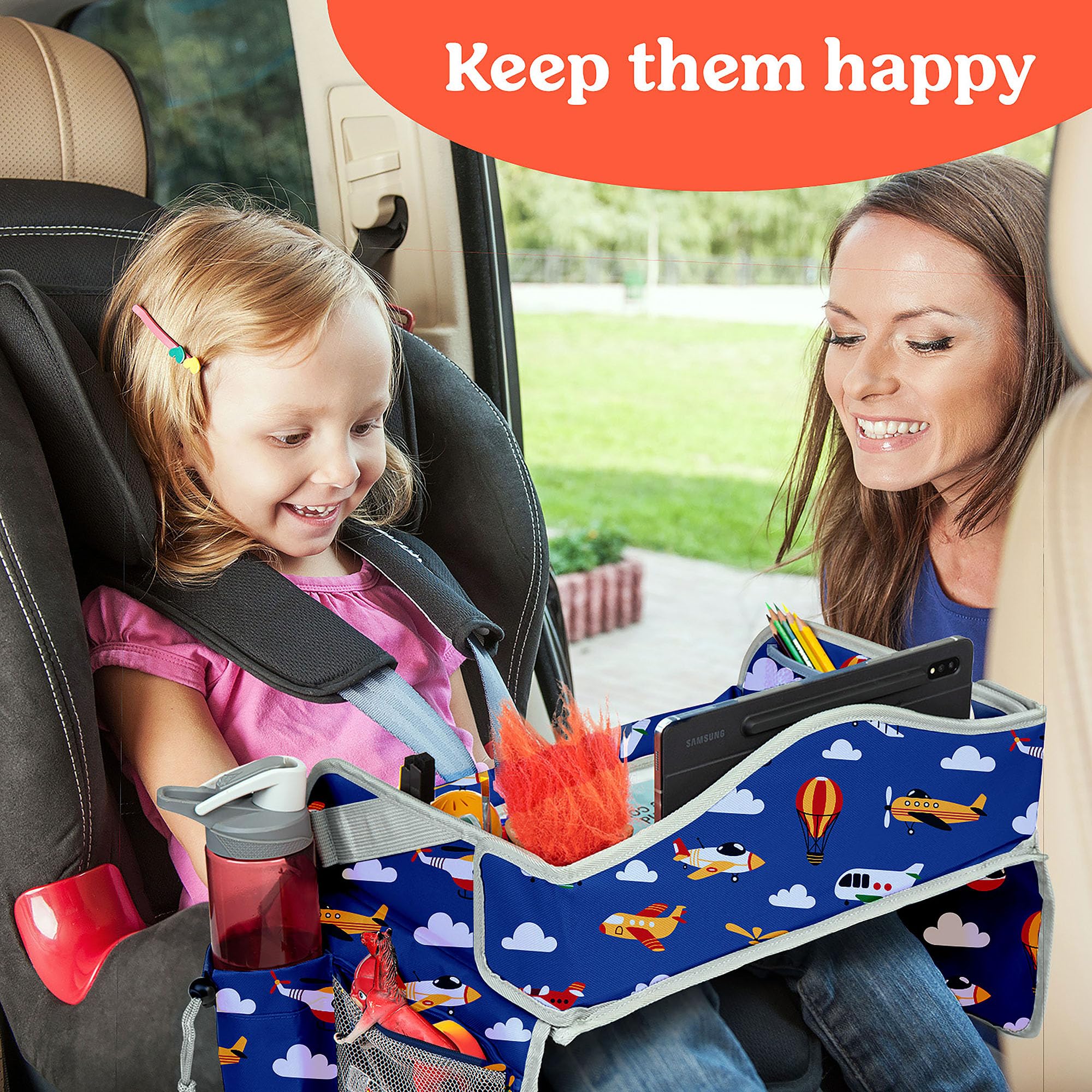【Portable Carseat Tray and Road Trip Must Haves】- Our car seat tray for kids has a compact size of 16.5 x 13 x 4.5 inches with easily accessible organization pockets. It sits securely on a child's lap and allows kids to enjoy road trips while drawing with their art supplies, having snacks, or playing with their favorite toys. This car seat tray will give parents the advantage of enjoying a quiet ride while their kids stay entertained when traveling or during airplane flights!