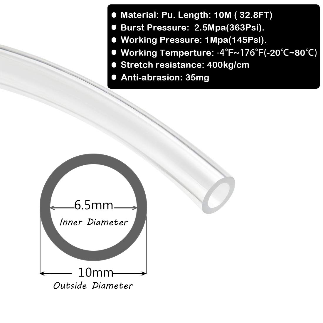 PU Tubing Pipe Size: 10mm (Outside diameter) 6.5mm (Inside diameter) , Package Total Length:32.8 Feet (10meters)
