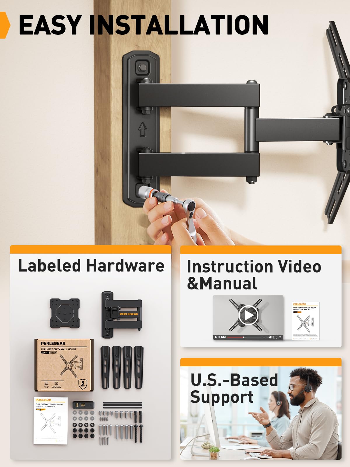 EASY INSTALLATION & US-BASED SUPPORT: We provide a user-friendly manual and instructional videos. We've also simplified the TV wall mount installation process, with all the necessary hardware included and clearly labeled. Rest assured that our US-based support team is ready to assist you with any questions or concerns.
