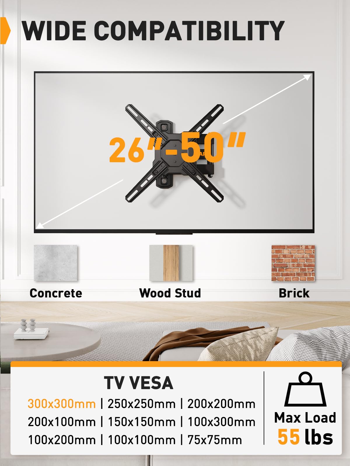 WIDE COMPATIBILITY: This swivel TV wall mount supports both TVs and computer monitors with 26" to 50" screens, 55 lbs Max weight, and 75 x 75mm to 300 x 300mm VESA mounting patterns. The TV mount is compatible with concrete, brick, and wood stud walls (needing only a single stud). Please note that it’s not recommended for mounting on drywall alone.