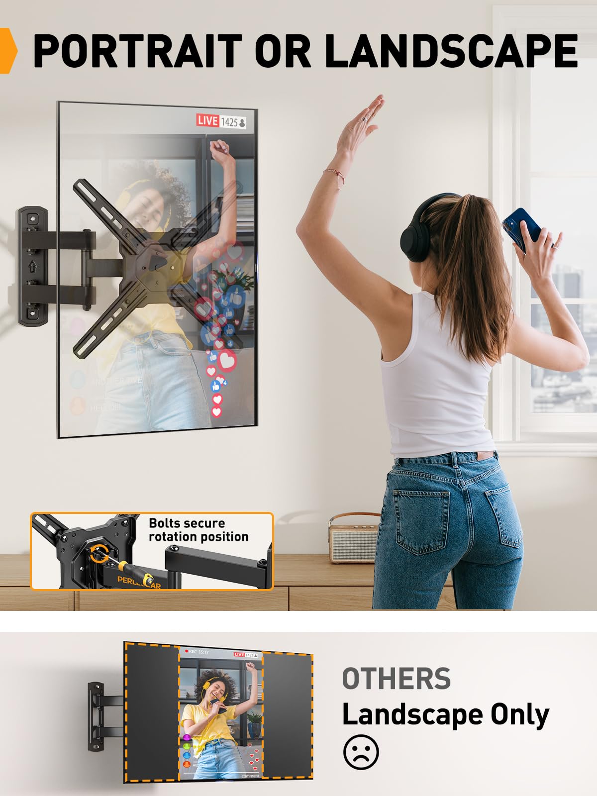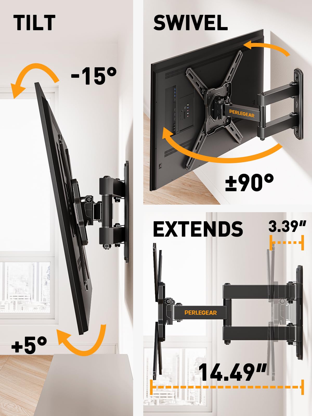 MAXIMIZED FLEXIBILITY: This full motion TV mount features impressive flexibility. Swivel your screen +/-90° for the optimal viewing angle. Tilt from -15° to +5° to reduce glare. Even rotate from landscape to portrait orientation with 90° locking intervals. The TV wall mount bracket also offers +/-3° post-install leveling.