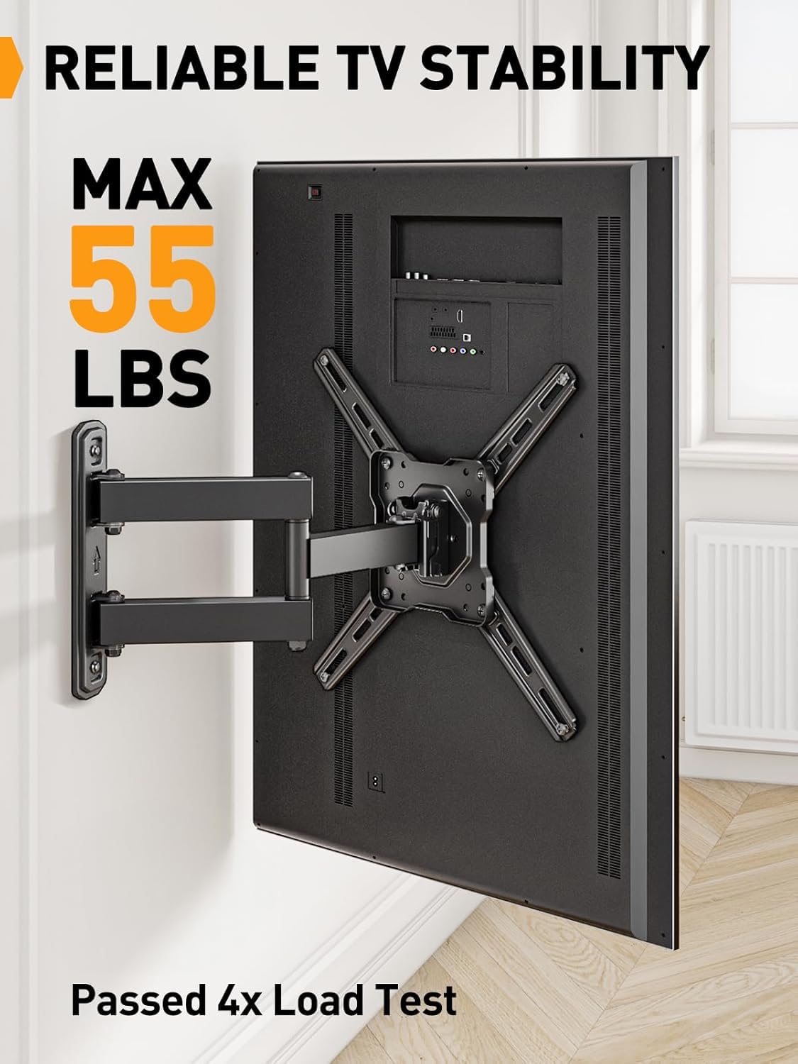 DEPENDABLE TV STABILITY: Your TV or monitor's security is our top priority. This TV wall mount has successfully passed a rigorous 4x load test, ensuring the 50 inch TV wall mount securely supports your valuable electronics. Its robust construction is designed for long-lasting durability.