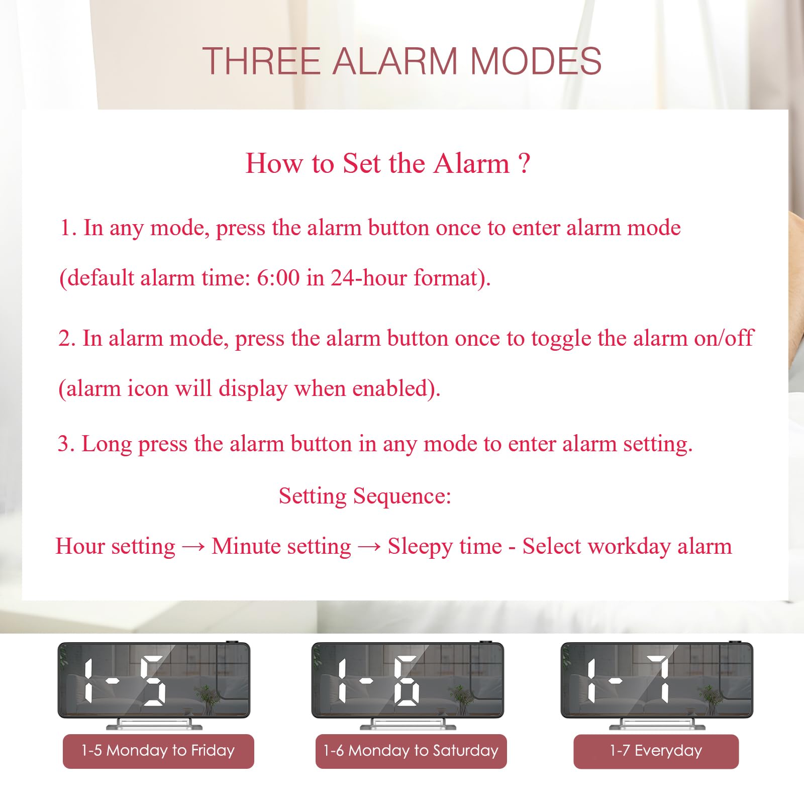 【Workday Alarm with Snooze】There are 3 alarm modes that can be set from Monday to Friday, Monday to Saturday, and Monday to Sunday. Snooze function allows you to get an extra 1-60 minutes of sleep, with the default being 5 minutes.