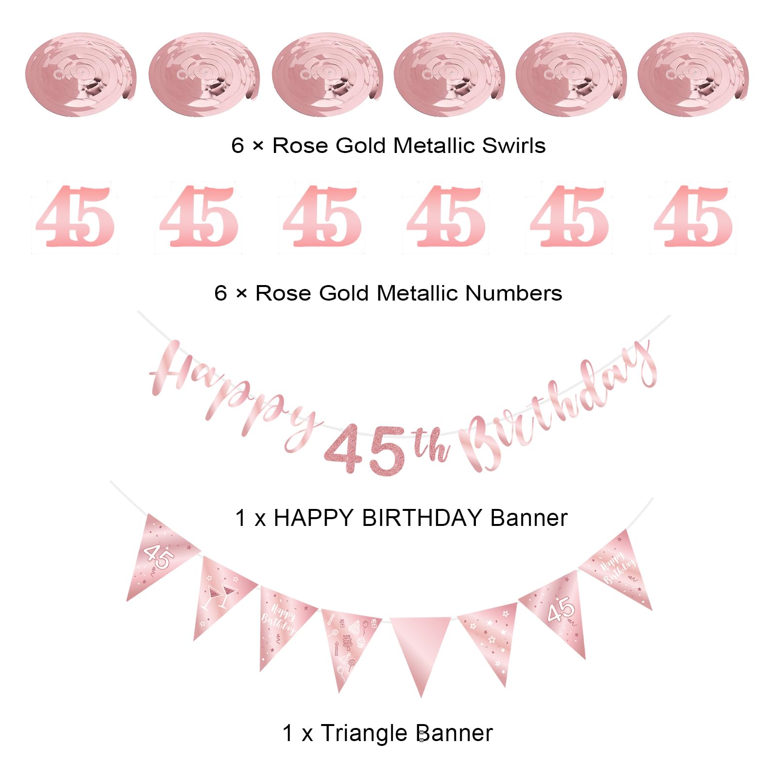 The 45th birthday decoration set perfectly fits your decoration preference. This will make your birthday party fabulously extravagant. The package includes: Happy 45th Birthday Banner x 1set triangle banner x 1set hanging swirl x 6pcs We also have birthday decoration kit for different ages such as 16th, 18th, 21st, 30th, 40th, 50th, 60th, 70th, 80th,90th...... Kindly for your attention that happy 45th birthday banner comes pre-assembled. You don’t need to spend time assembling it. Suggestion: use it with our other pink and gold birthday balloons , tissue flowers and other decorations to get a elegant rose gold world.