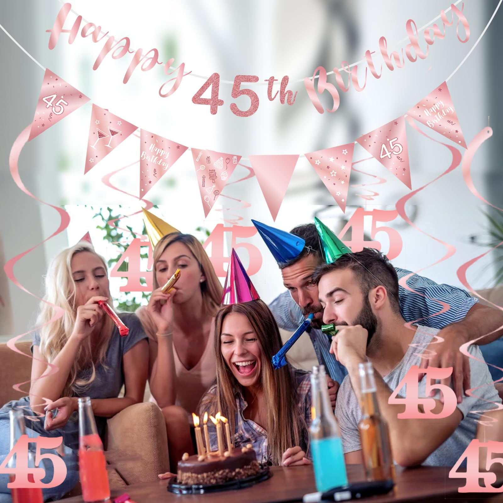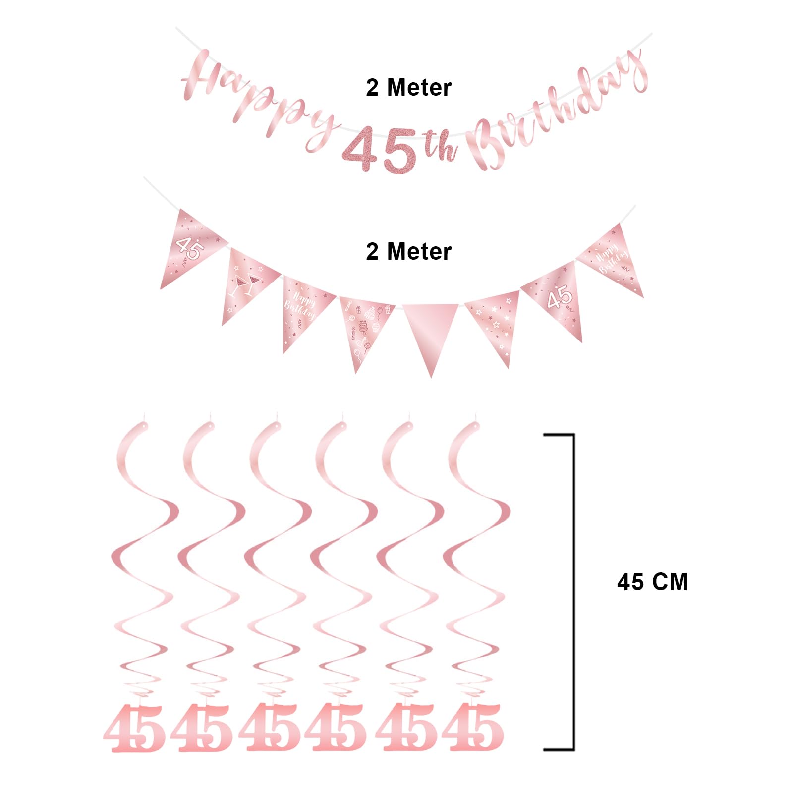 The package includes: Happy 45th birthday banner(1 set), triangle banner(1 set), hanging swirls(6 pcs).