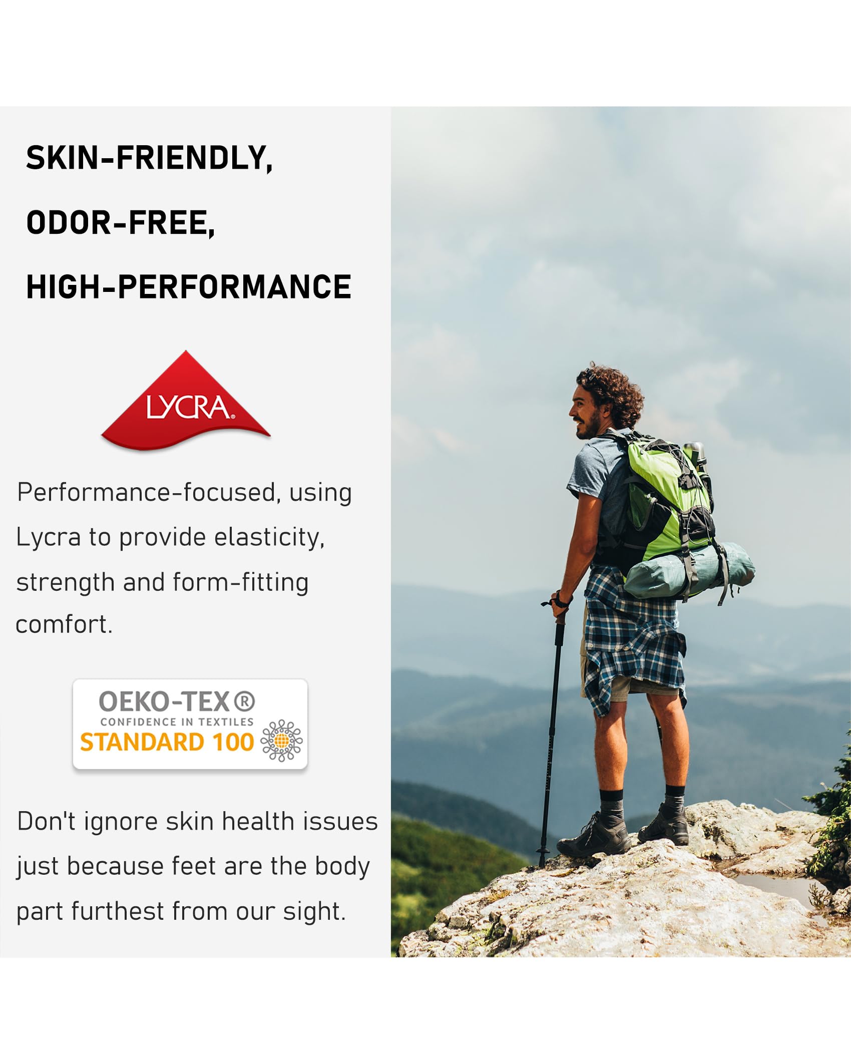 Preferred Oeko-Tex Standard 100 skin-friendly material; Sole made of combed cotton and tech-dry yarns for moisture wicking, non-slip, anti-odor and durable