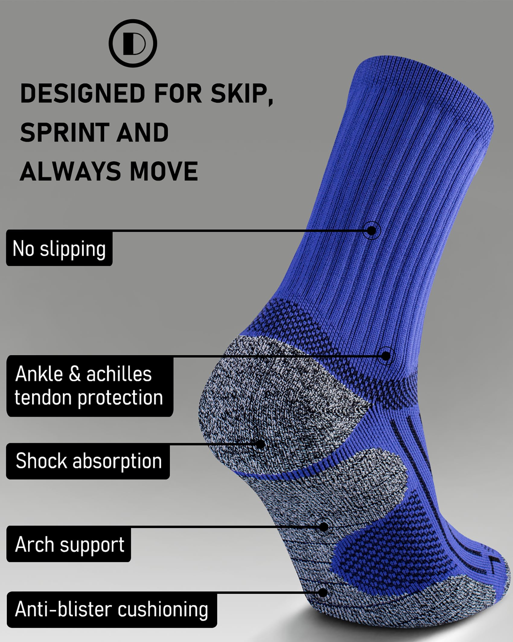 Targeted cushioning and compression, shock absorption, anti blister, arch support, ankle and achilles tendon protection