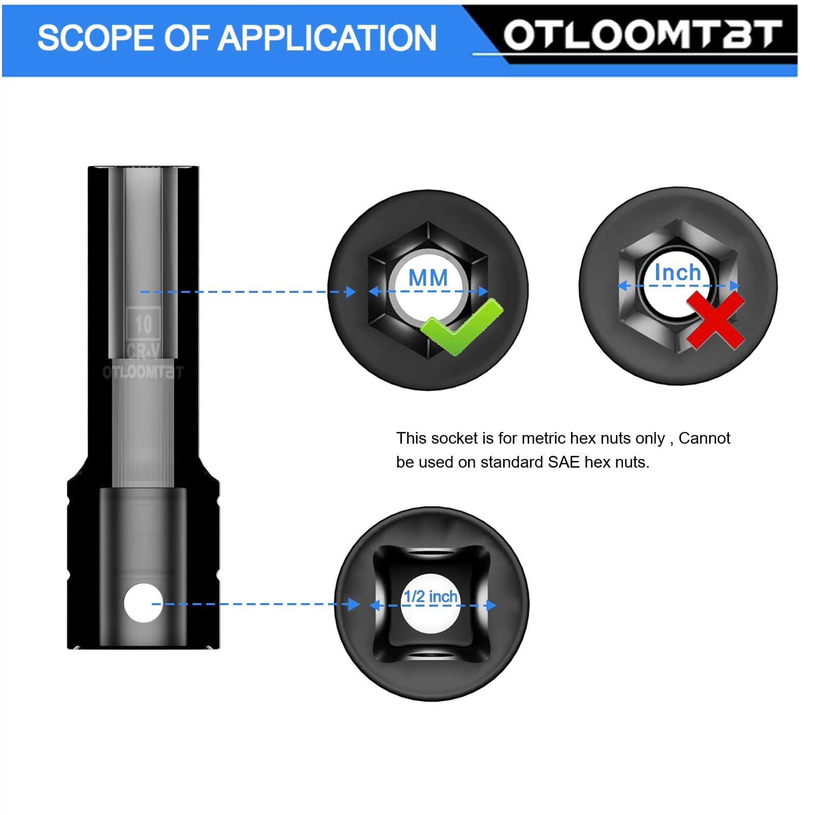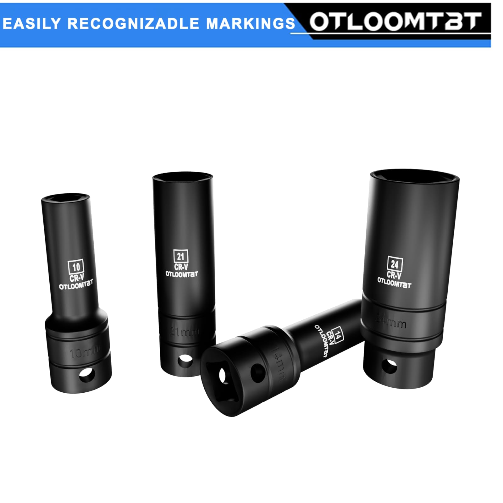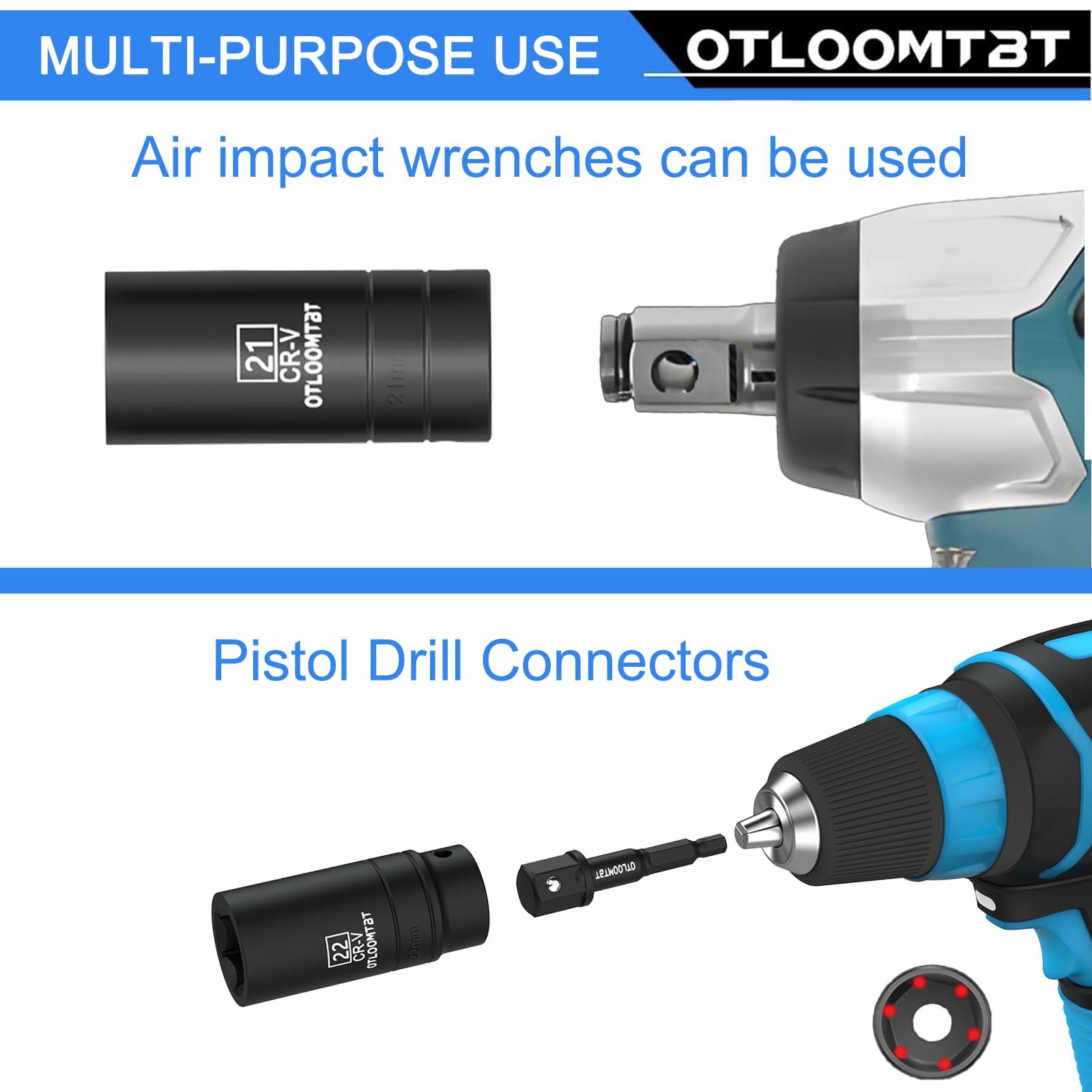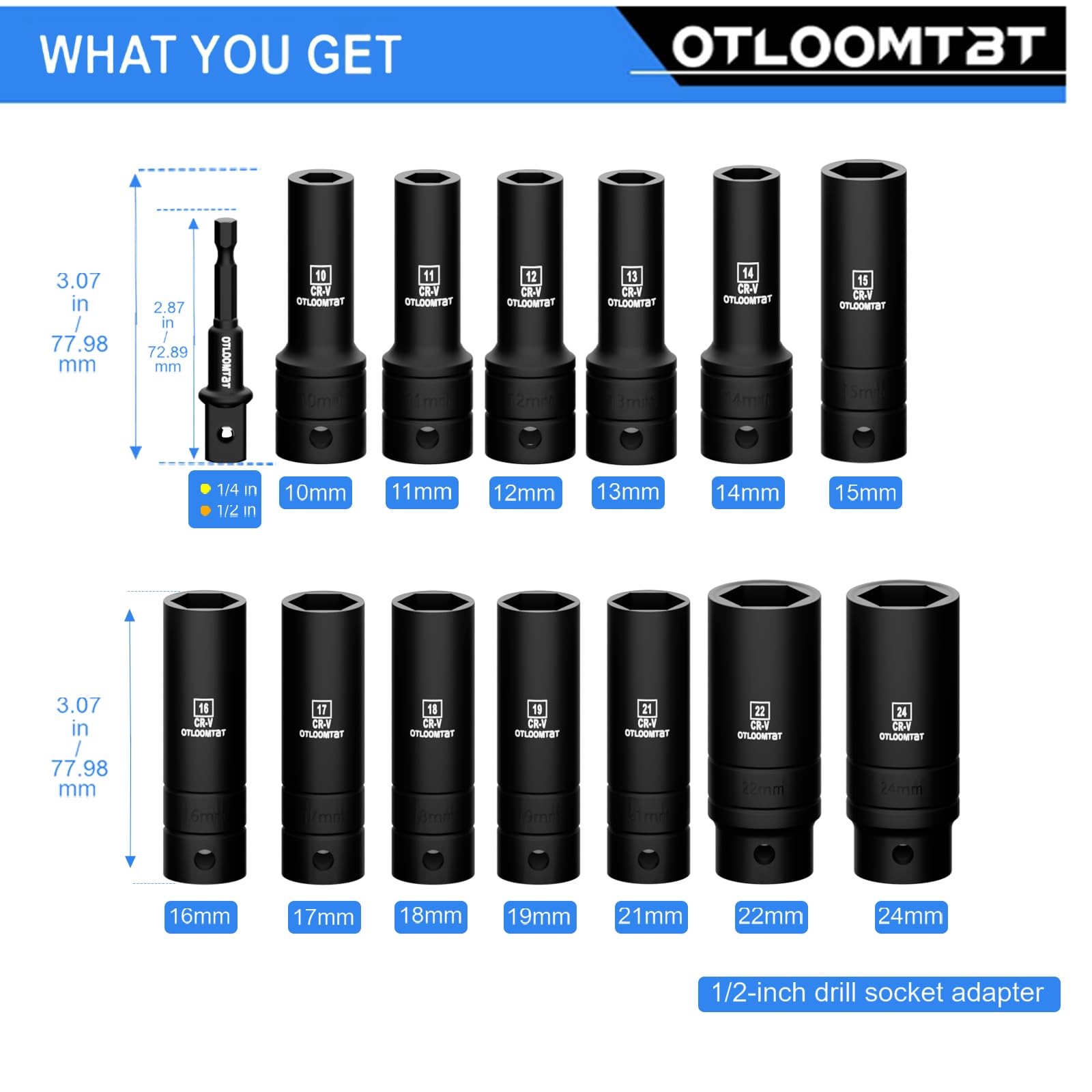 【What You Get】 13 × Metric Deep Sockets: 10, 11, 12, 13, 14, 15, 16, 17, 18, 19, 21, 22, 24mm, 1X 1/2-inch drill socket adapter
