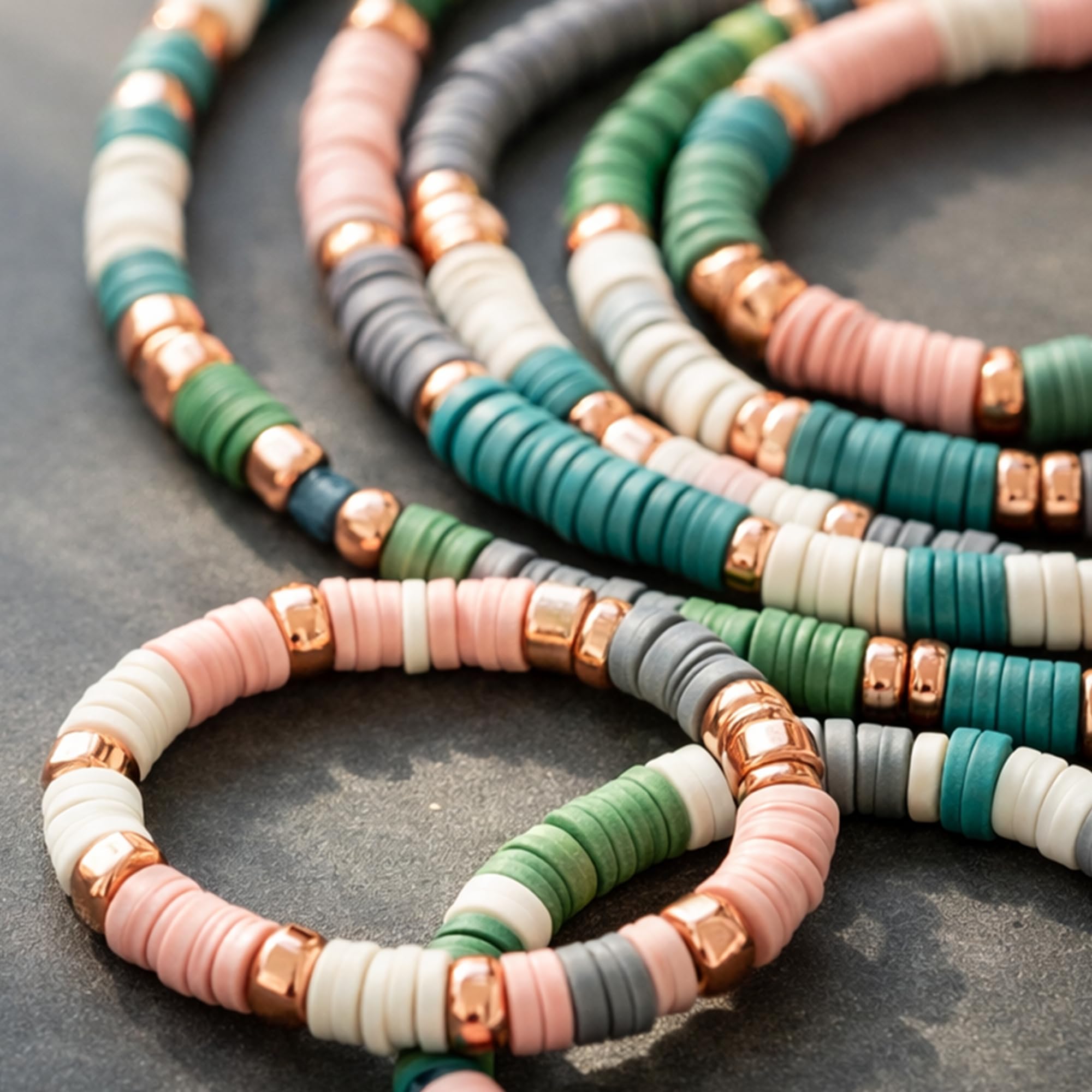 6mm Heishi Beads Bulk Adult Beading Set: This assortment includes 3000 lightweight, waterproof clay rubber beads and a roll of clay bead string for small-batch production and preppy-style color palettes used in contemporary adult jewelry design.