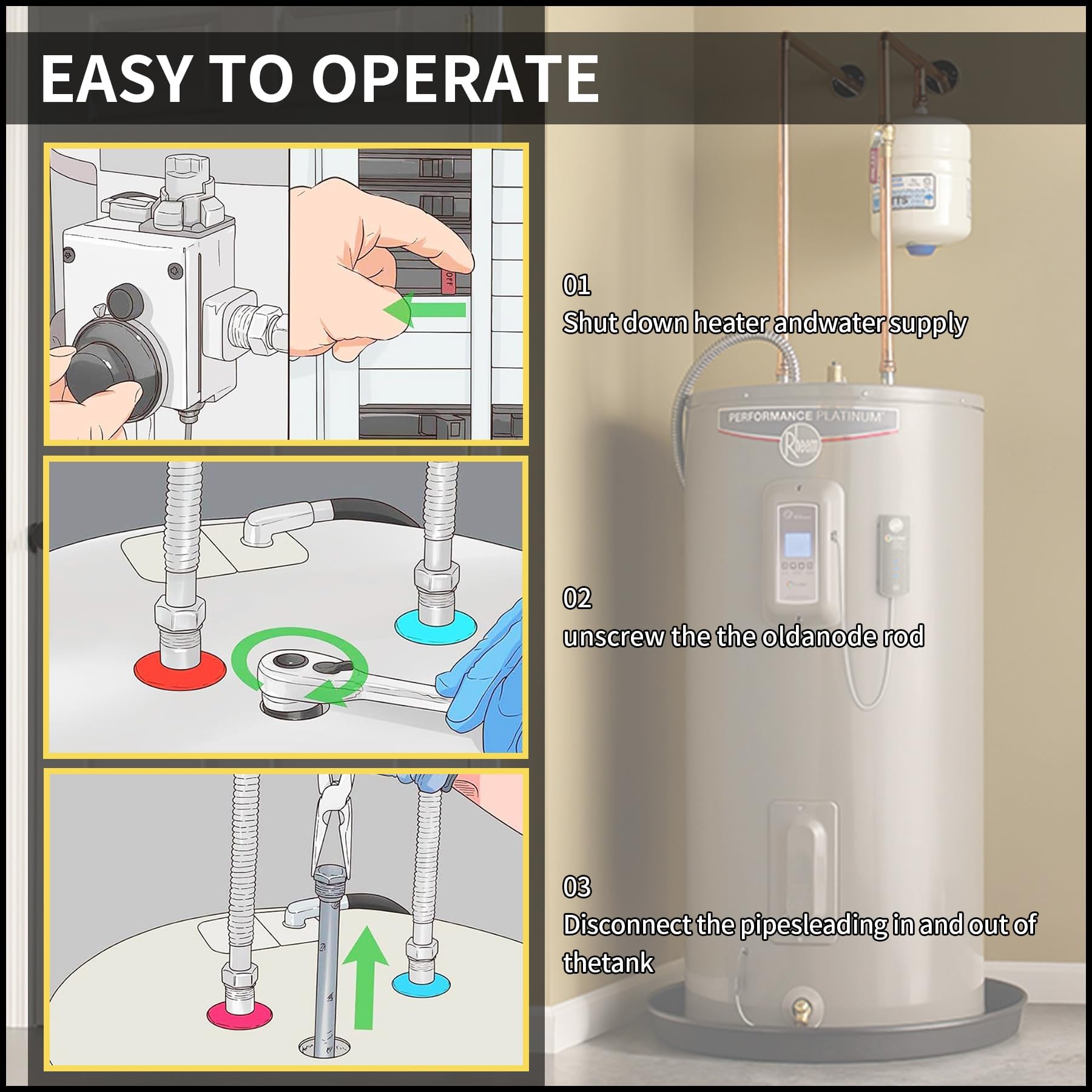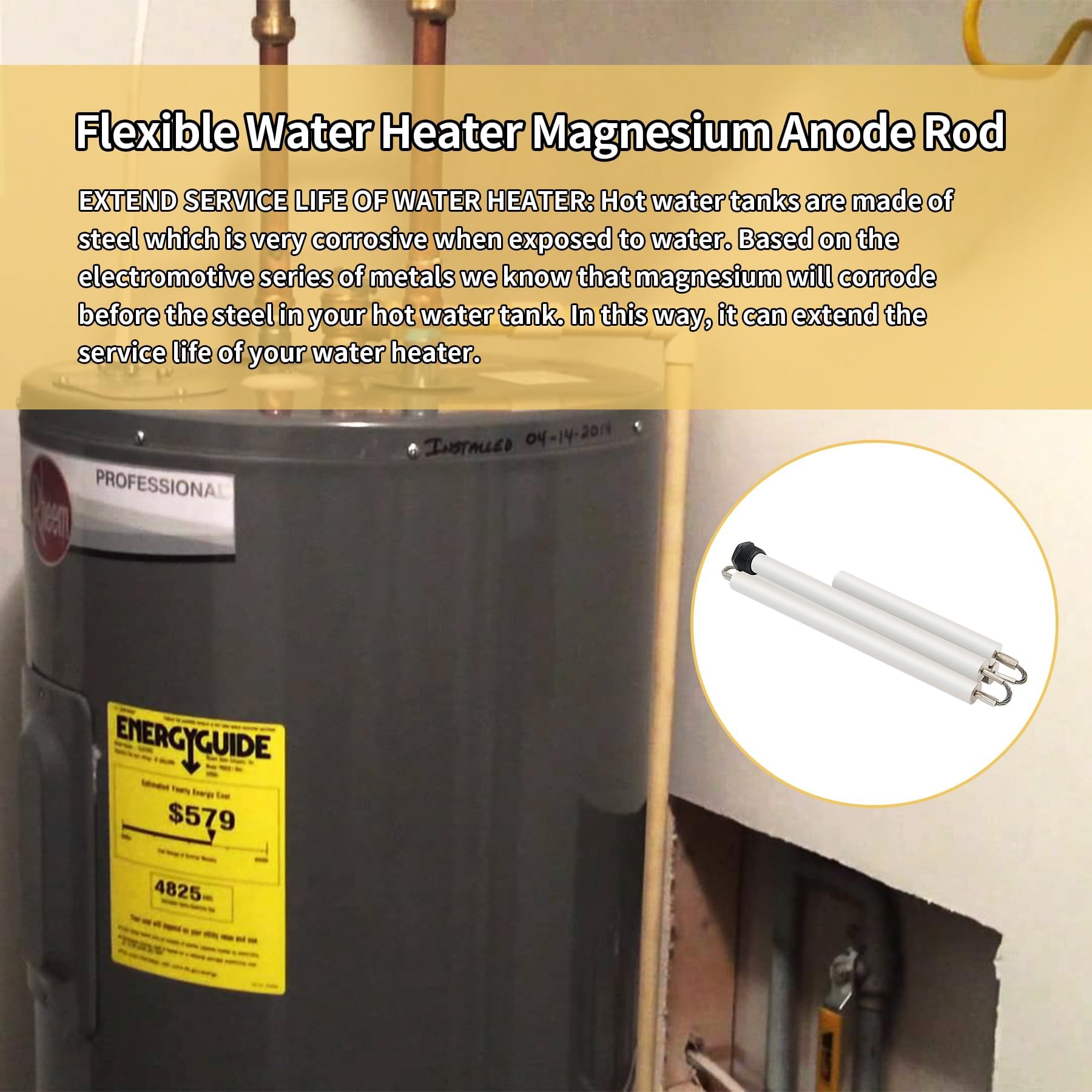 【Package Includes】: 1 X 44" Flexible Magnesium Water Heater Anode Rod Replacement Kit. Anodes are designed to be easily and regularly replaced. Their only purpose is to decay instead of your water heater, and that's exactly what it will do. Inspecting and changing your anode rod every 2 years will keep your water heater’s tank, strong reliable and off your mind