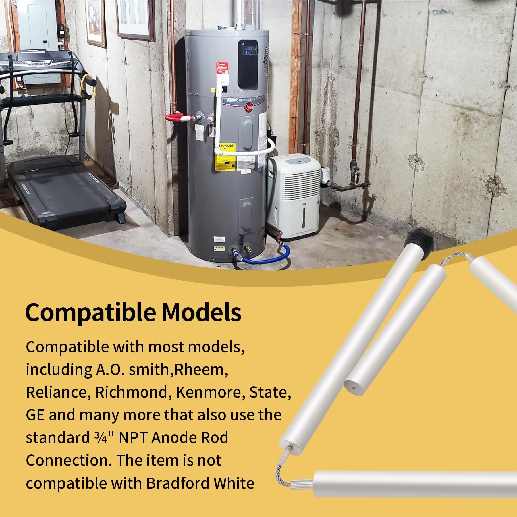【Replace】: 44" Flexible Magnesium Water Heater Anode Rod Replacement Kit Compatible with almost all water heaters including; A.O. smith,Rheem, Reliance, Richmond, Kenmore, State, GE and many more that also use the standard ¾" NPT Anode Rod Connection