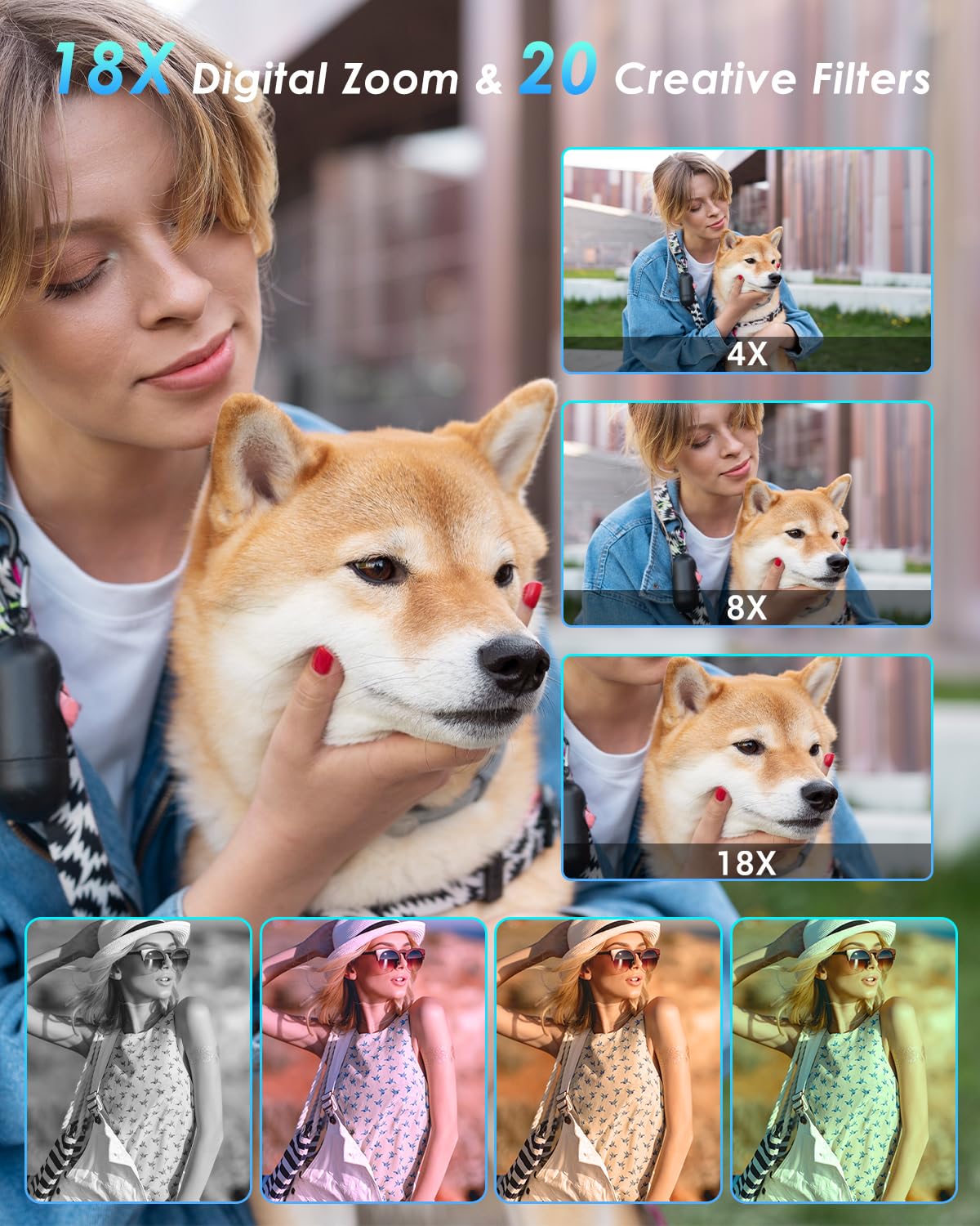 18x Zoom, Flash & 20 Creative Filters: Bring distant subjects closer in stunning clarity with the 18x digital zoom. This point and shoot digital camera also lets you unleash your creativity with 20 fun filters and a beauty mode, enhancing your shots instantly—no editing required. Plus, its powerful built-in flash cuts through the darkness, ensuring your photos are bright and clear, day or night
