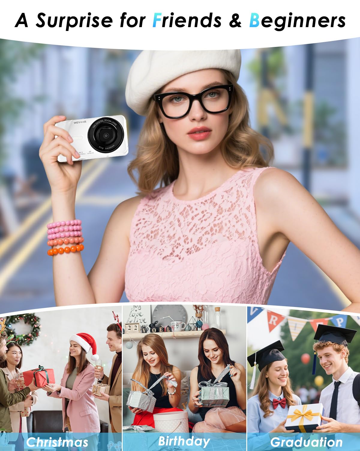 Ultra-Portable & Easy to Use: At just 0.3 lbs (140g), this pocket-sized camera goes anywhere—lightweight and hassle-free. The 2.8" LCD screen with simple one-touch buttons makes it ideal for teens, adult and beginners (no complicated menus!). An ergonomic grip ensures steady one-handed shots while keeping your fingers clear of the lens