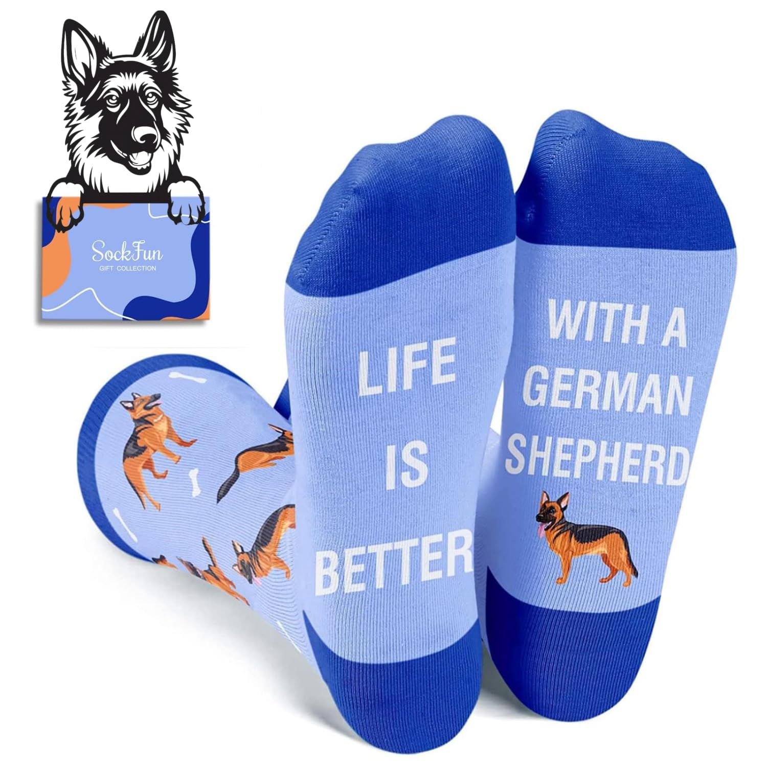 GERMAN SHEPHERD WOMEN SOCKS - Our funny dog socks are designed for both women and men and feature cute German Shepherds and bones in blue, with the funny sayings "LIFE IS BETTER WITH A GERMAN SHEPHERD."