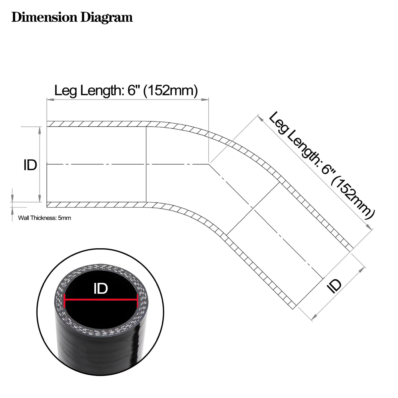 SIZE: 45 degree radiator hose size is 1.75 inch (45mm), Leg Length 6 inch (152mm).