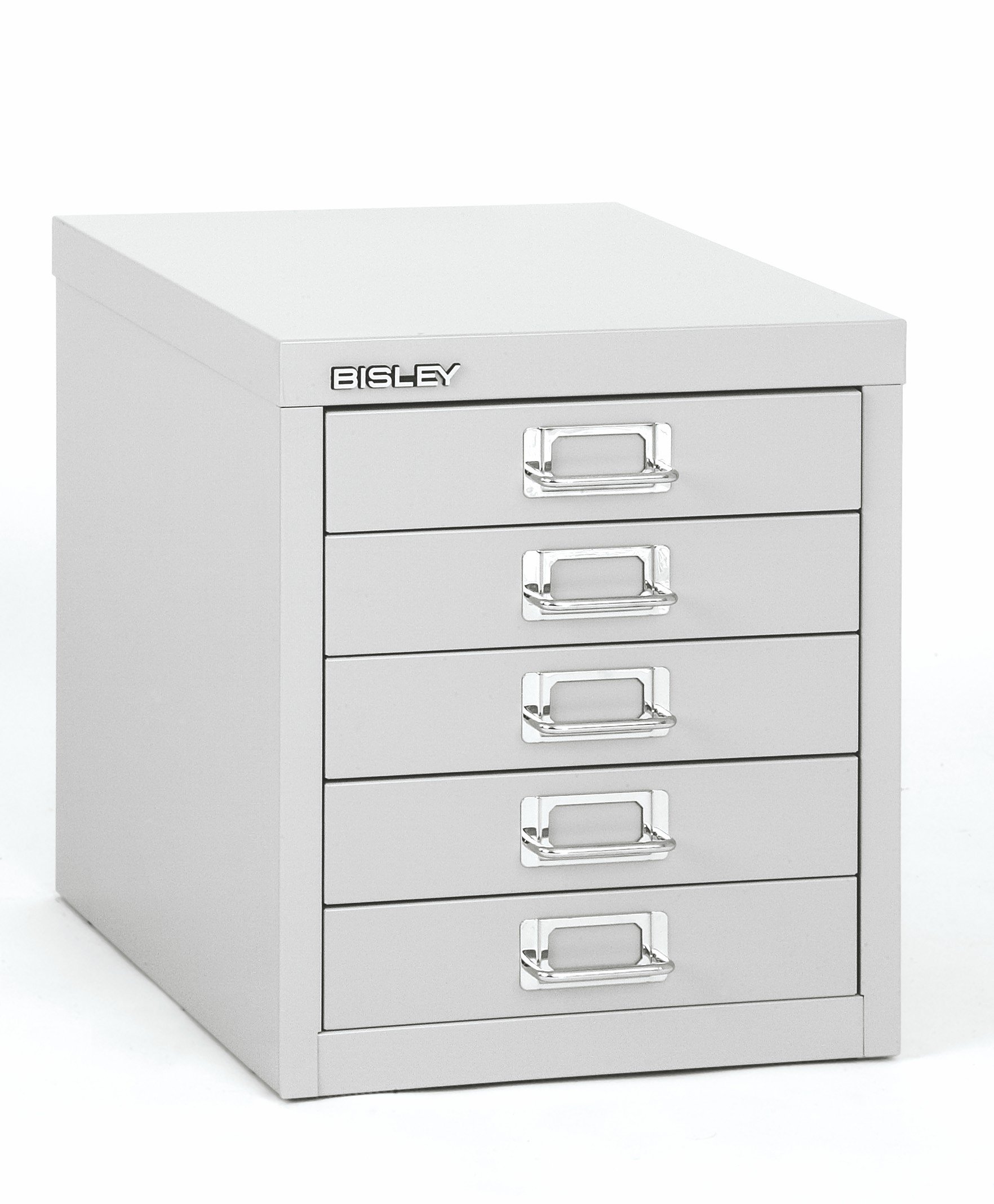 Sleek chrome pull handles with label slots on every drawer and a sheet of customizable labels help you identify drawer contents easily