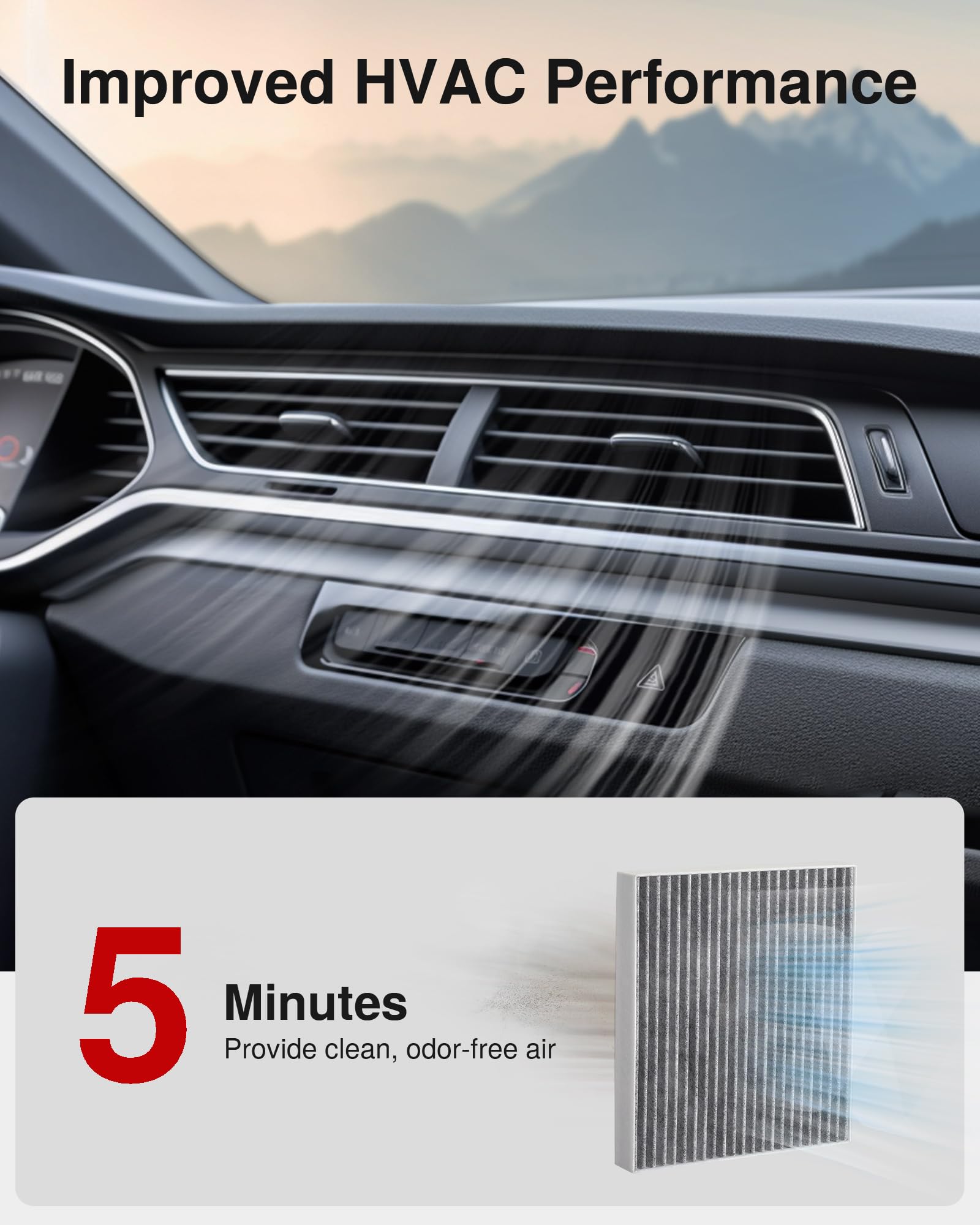 Enhances HVAC performance: It is recommended to replace your cabin air filter every year or every 12,000 miles. For optimal performance, those driving in heavily polluted areas or on dirt roads should change it every 5,000 miles. These filters help maintain the efficiency and longevity of the vehicle's heating, ventilation, and air conditioning (HVAC) system, maintaining optimal airflow and reducing strain on the system.