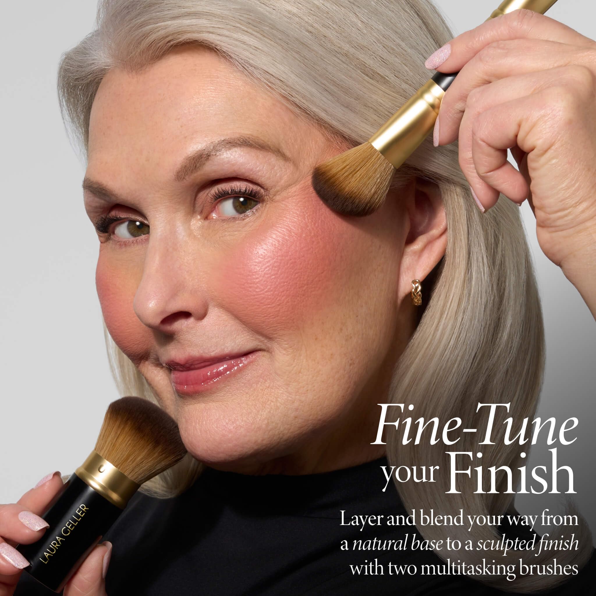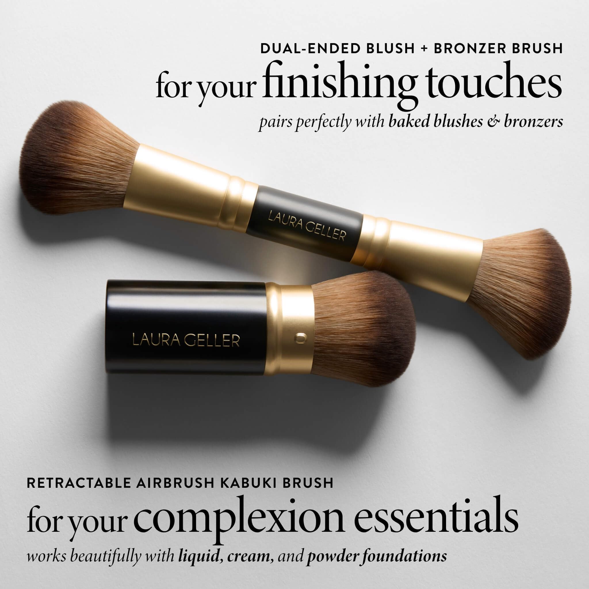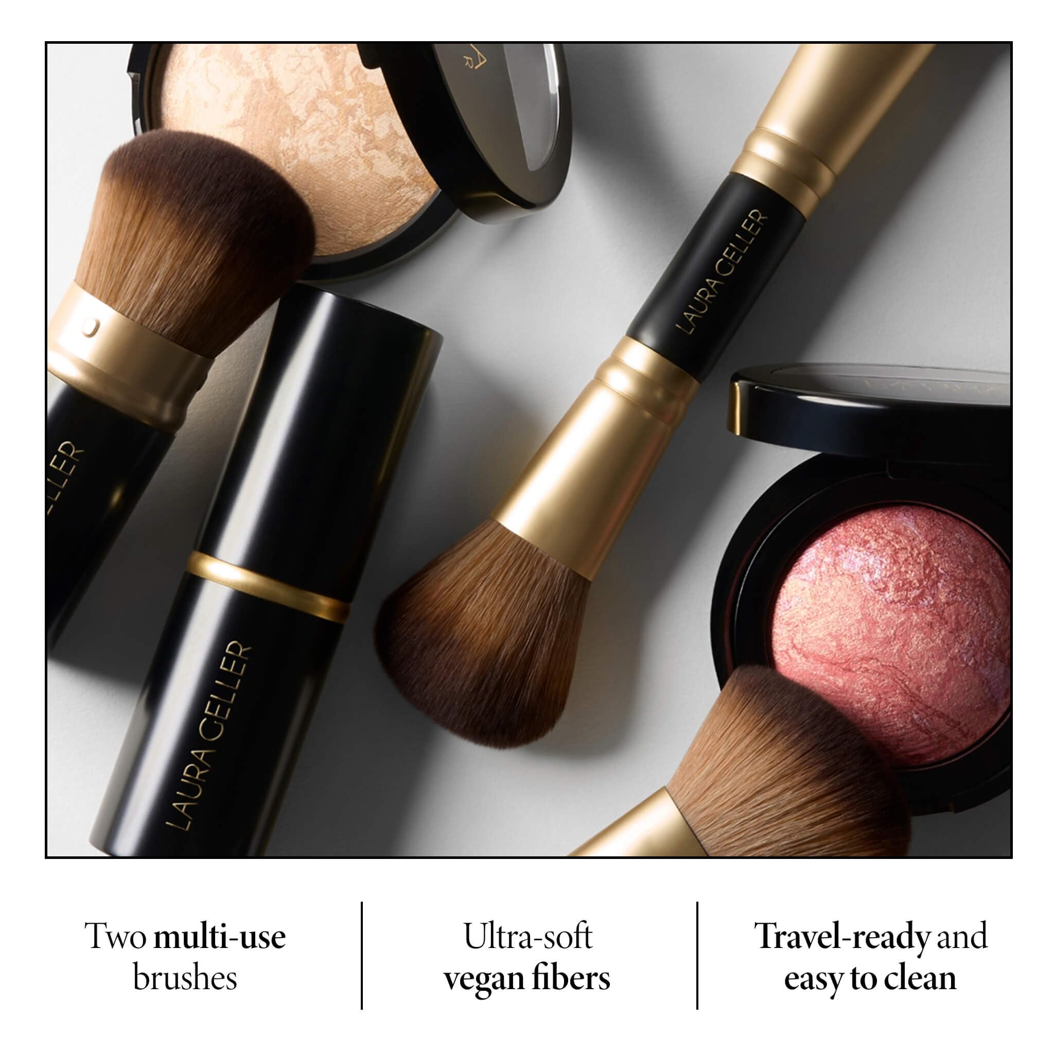 FACE IT ALL 2PC MAKEUP BRUSH SET: Laura Geller's professional-grade set of synthetic vegan makeup brushes are perfect for applying all of your baked makeup products. Use this duo to apply cream to powder baked and liquid foundations, blushes, bronzers, and highlighters with ease.