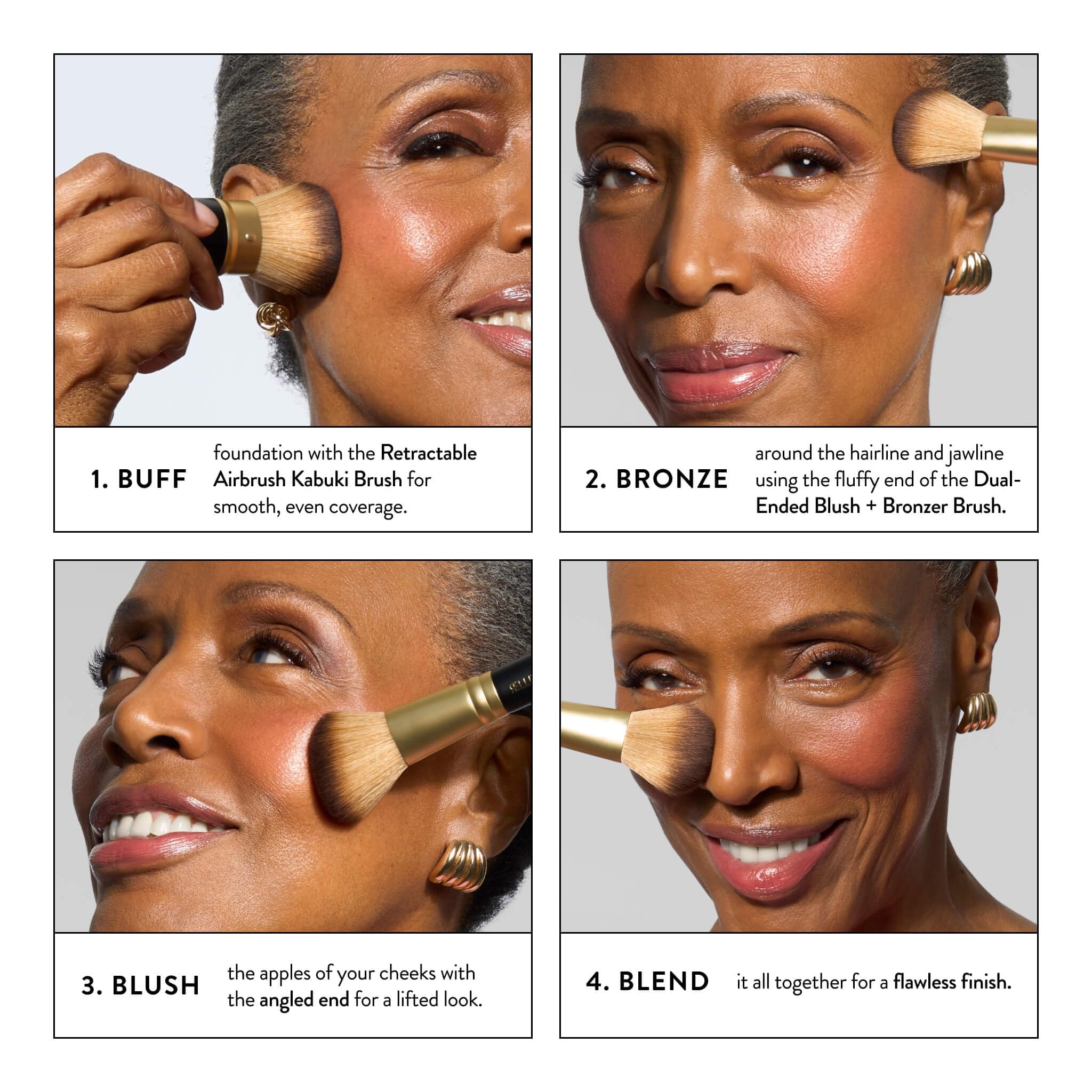 VERSATILE MAKEUP BRUSHES: This makeup brush set is all about versatility. The Retractable Airbrush Kabuki Brush includes a mess-free cap to keep it clean in your makeup bag. Plus, the Dual-Ended Blush + Bronzer Brush is like two makeup application tools in one!