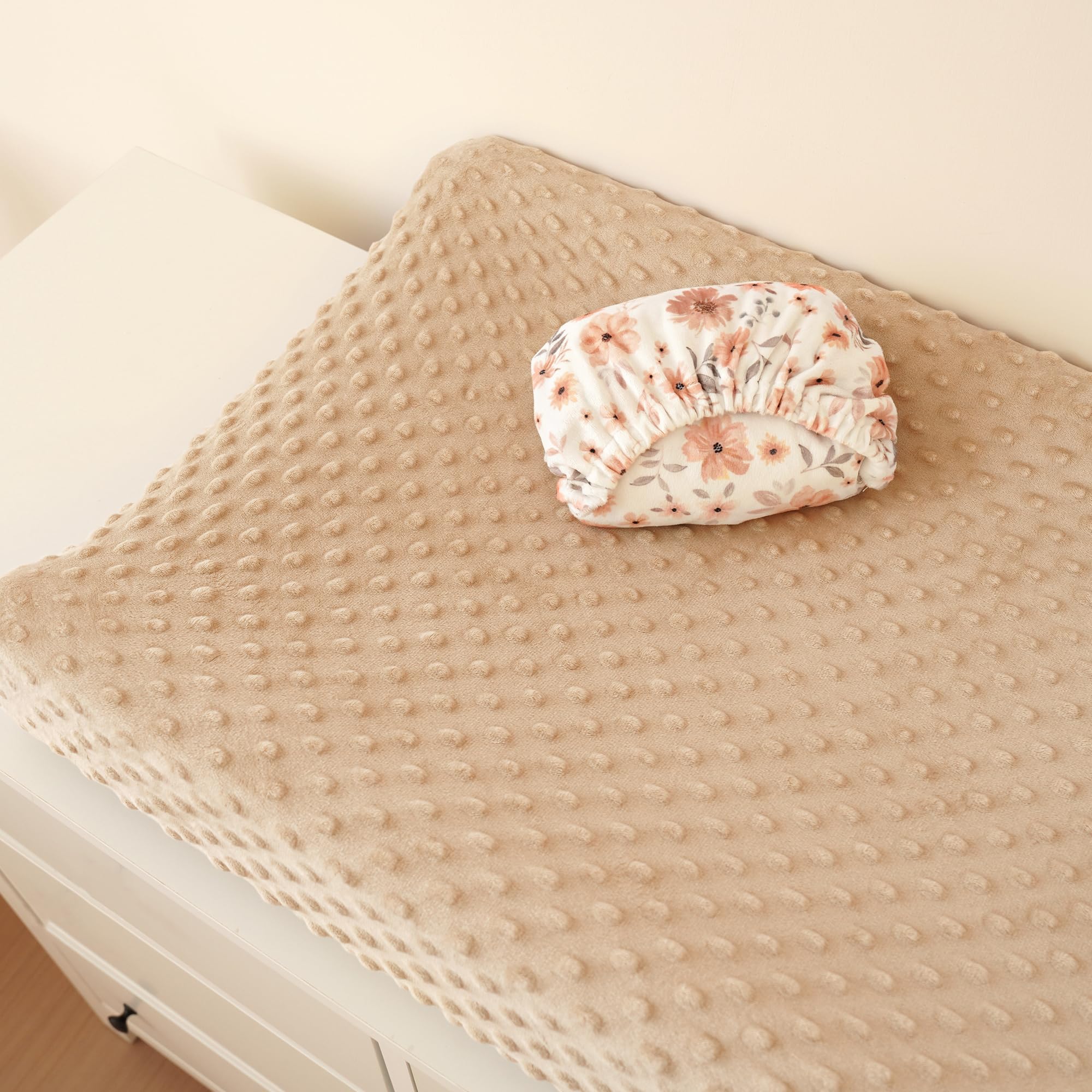 Soft Minky Fabric: Our changing pad cover is made from soft and gentle minky fabric, providing a comfortable surface for your baby's diaper changes. One features minky dot fabric for texture, while the other is smooth, providing different tactile options
