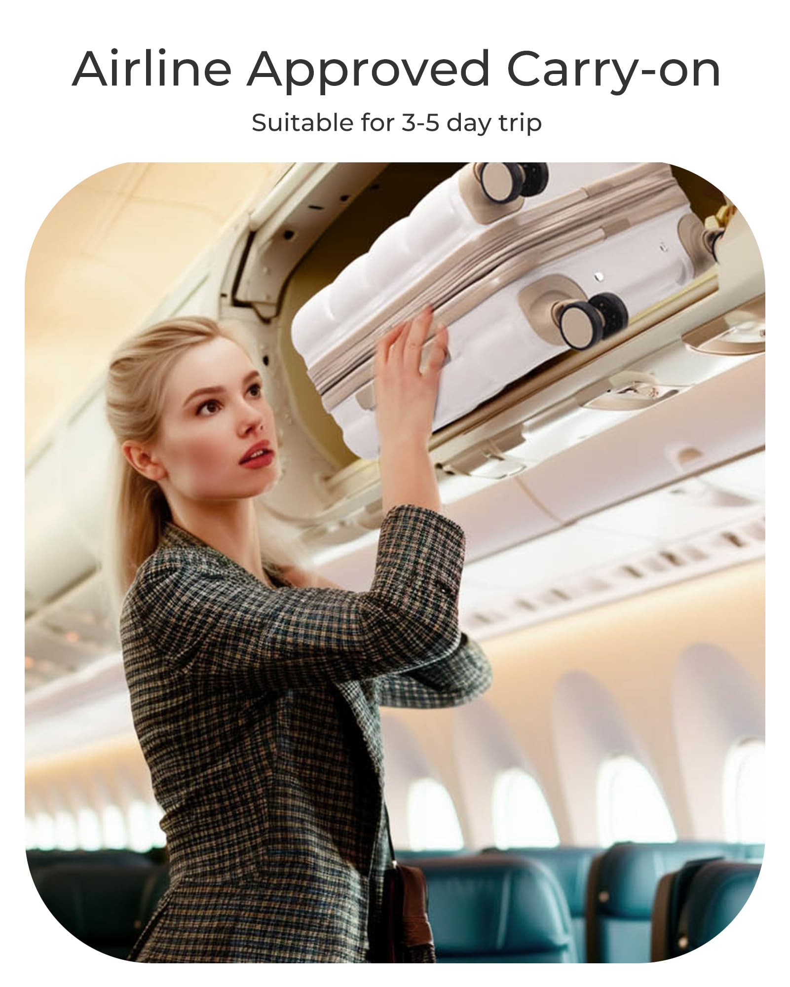 Airline Approved Luggage: Dimensions: 22.4 x 13.7 x 9.6 in (wheel and handle height included). Volume: 35 L. Weight: 6.39 lbs. The 20" carry-on luggage size is designed to meet the airline requirements for most major airlines as a carry-on suitcase that can be placed in the overhead bin of almost any flight, anywhere in the world. No more paying for temporary consignments.