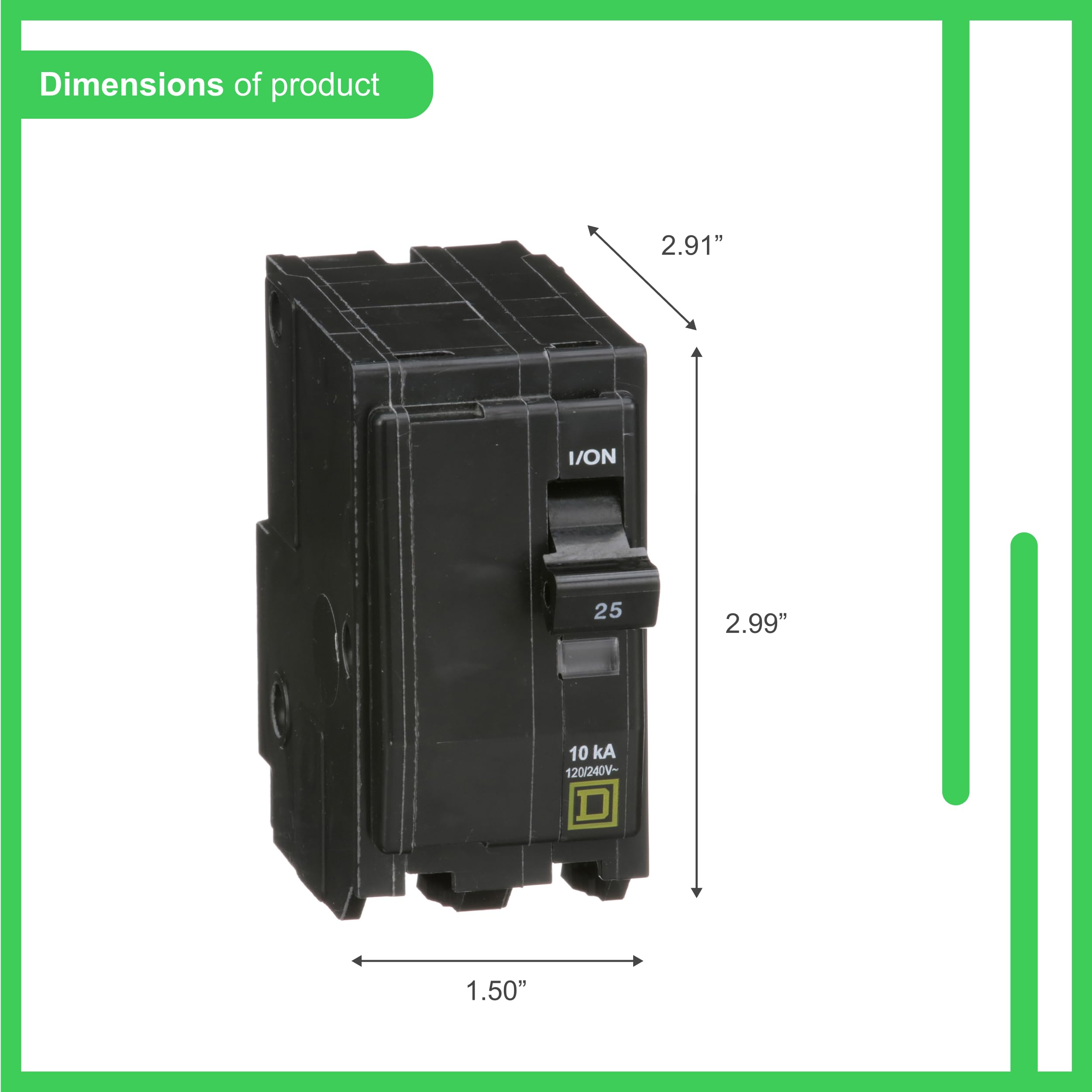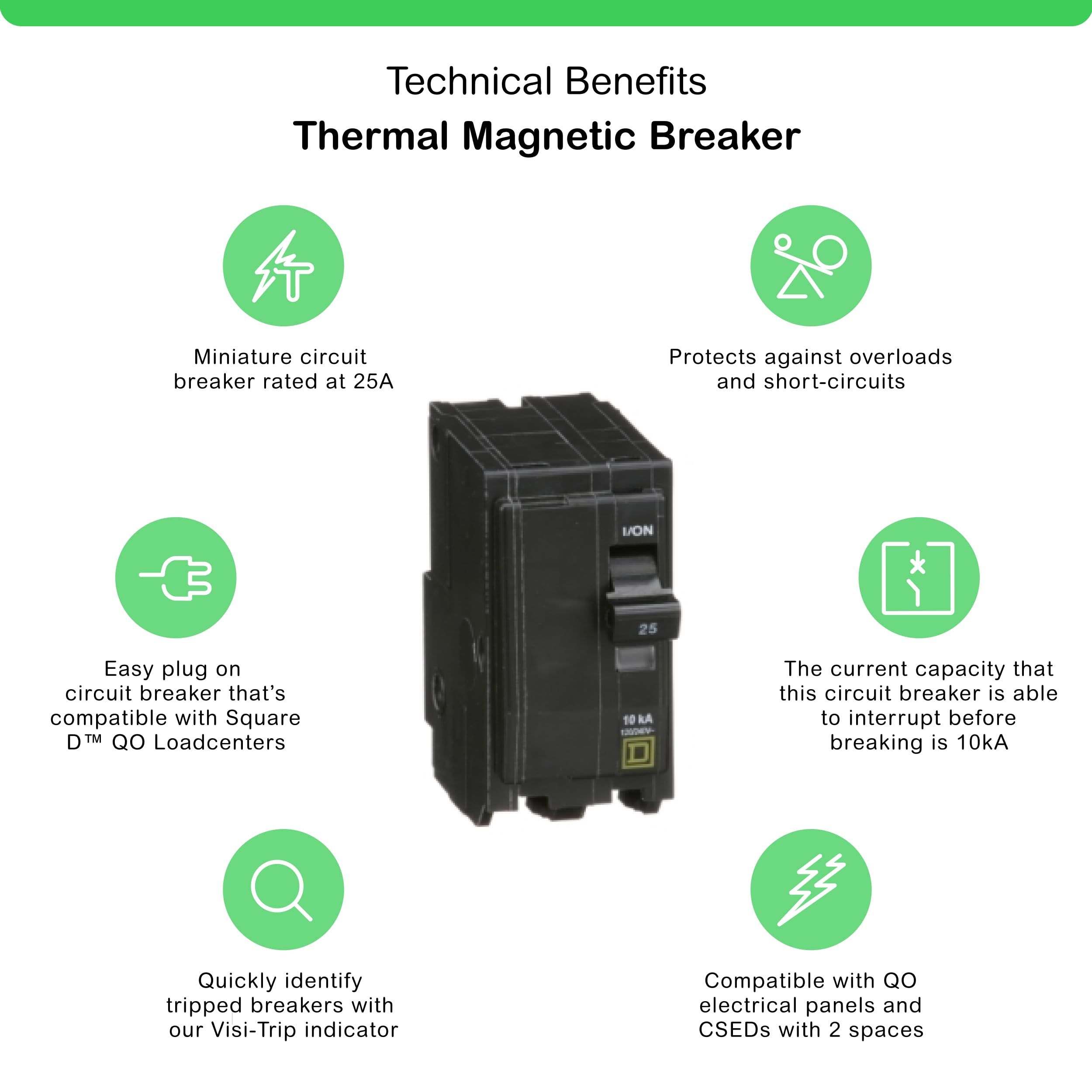 Product Description The Square D by Schneider Electric QO 25 Amp Two-Pole Circuit Breaker is intended for overload and short-circuit protection of your electrical system. The ANSI-certified and UL-listed unit is rated for 120/240 VAC and 10,000 AIR. All QO circuit breakers are equipped with the exclusive Visi-Trip indicator. When a QO Visi-Trip circuit breaker trips, the handle snaps to a midpoint position between "OFF" and "ON" and a highly visible, red indicator easily identifies the tripped breaker. This enables you to easily distinguish which breaker has tripped in a load center that may contain up to 42 different circuit breakers. QO circuit breakers have features no other manufacturer can offer. They come in many different sizes and can meet the needs of virtually every function in your home or business. These types of quality, industry exclusive products keep the Square D brand ahead of the competition and are builders' and electrical contractors' first choice in electrical protection. Manufacturer Contact Information PALATINE, IL, 60067 US